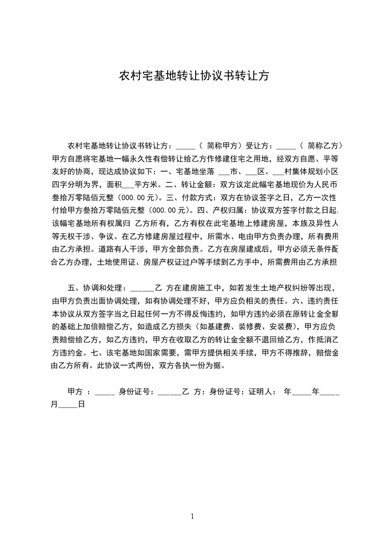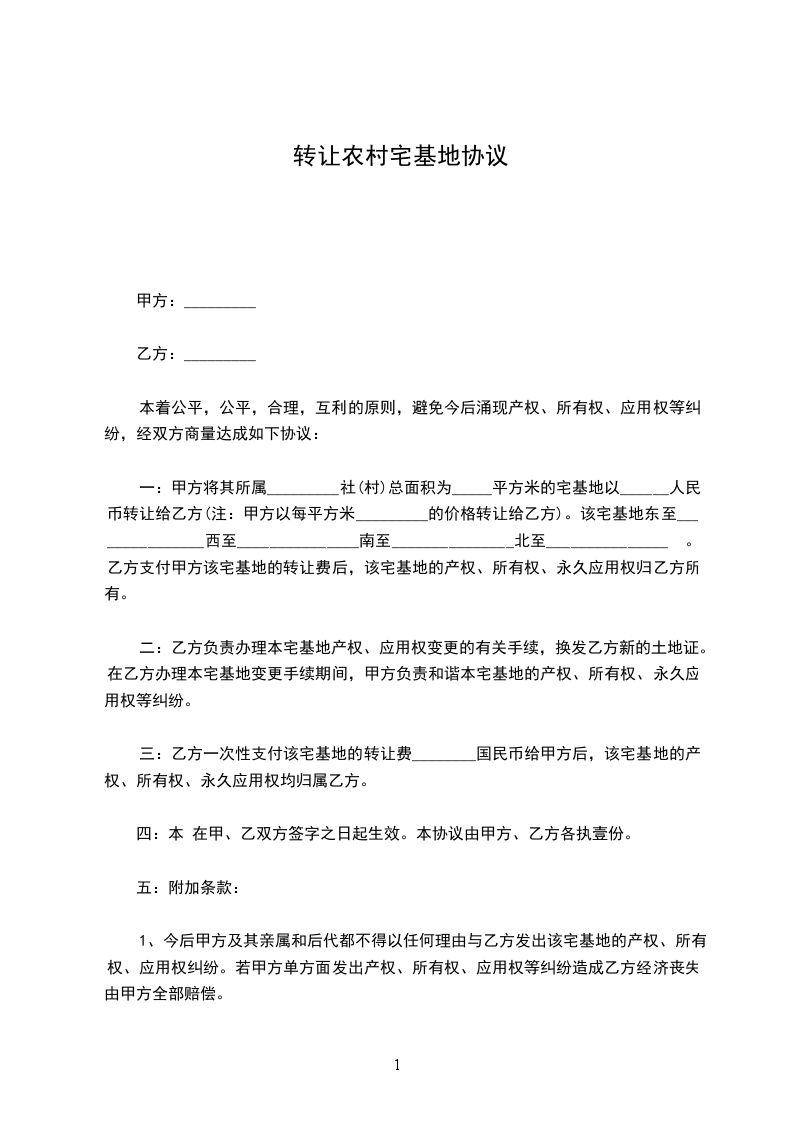 一、甲方转让的宅基地位置为_____________,该宅基地登记面积共___平方米;