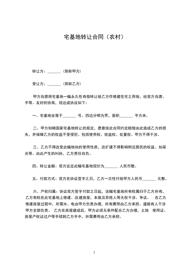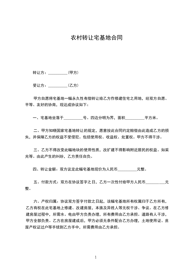 八、甲方违反本协议导致宅基地不能过户或无故进行交付,甲方应支付给乙方违约金___万元;乙方未按本协议付款,乙方应支付给甲方违约金___万元。九、本协议一式二份,各方各执一份。自甲、乙双方签字后生效,未尽事宜双方协商解决。