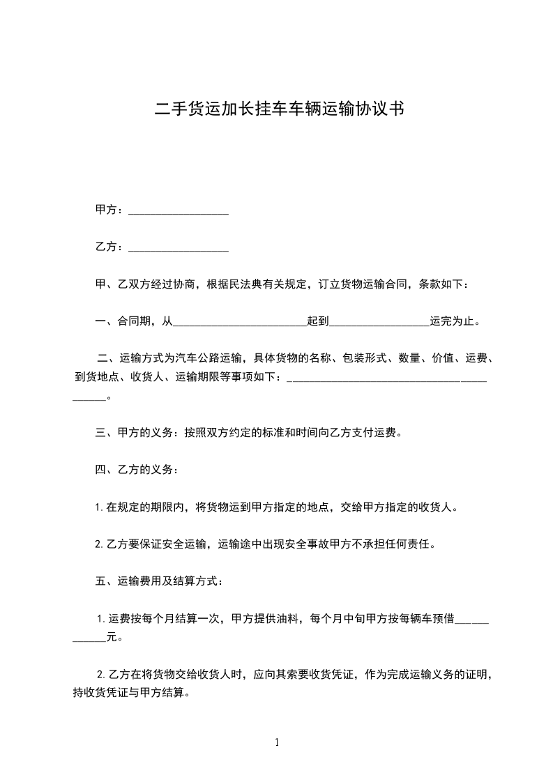 二、运输方式为汽车公路运输,具体货物的名称、包装形式、数量、价值、运费、到货地点、收货人、运输期限等事项如下:__________________________________________。