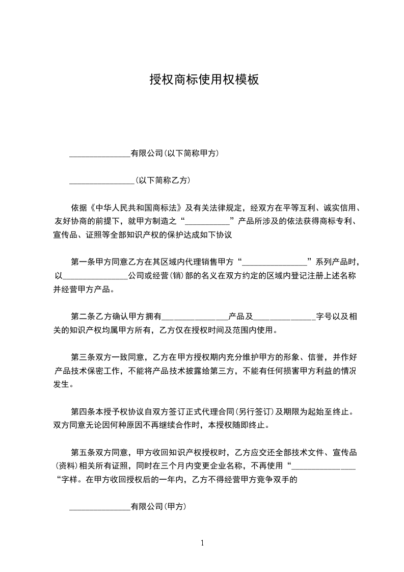 第一条甲方同意乙方在其区域内代理销售甲方“________________”系列产品时,以________________公司或经营(销)部的名义在双方约定的区域内登记注册上述名称,并经营甲方产品。