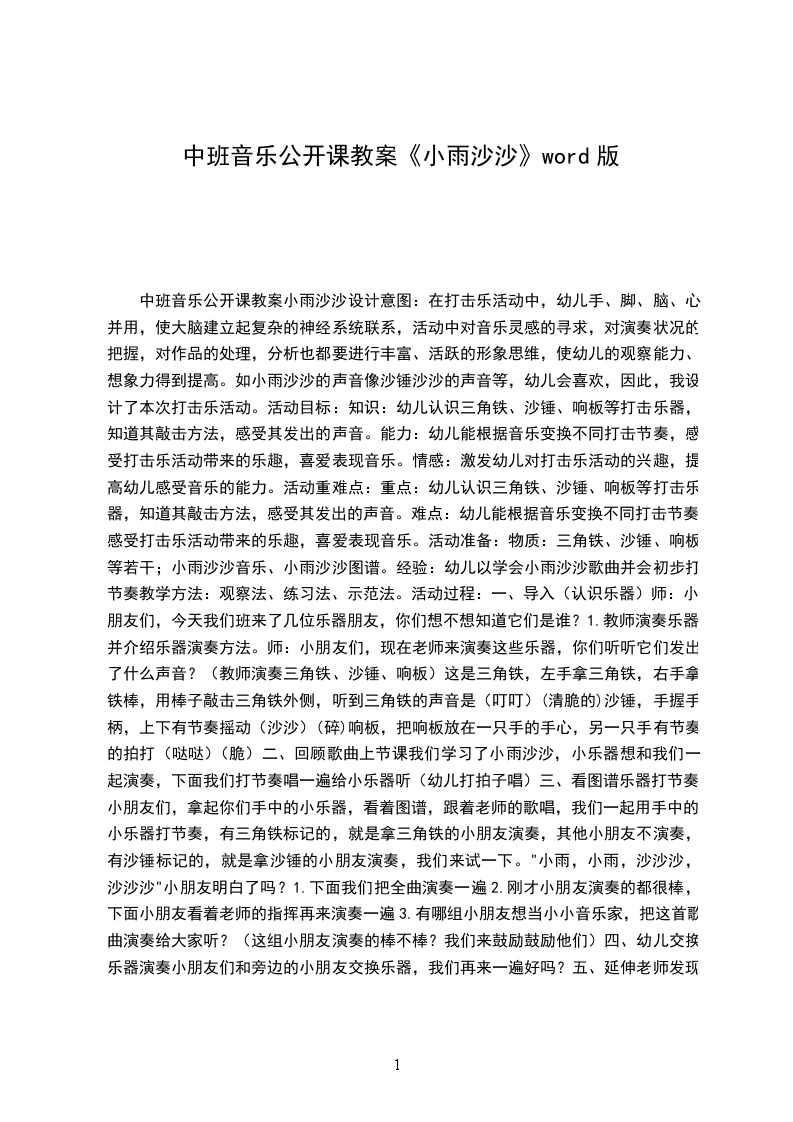 中班音乐公开课教案小雨沙沙设计意图:在打击乐活动中,幼儿手、脚、脑、心并用,使大脑建立起复杂的神经系统联系,活动中对音乐灵感的寻求,对演奏状况的把握,对作品的处理,分析也都要进行丰富、活跃的形象思维,使幼儿的观察能力、想象力得到提高。如小雨沙沙的声音像沙锤沙沙的声音等,幼儿会喜欢,因此,我设计了本次打击乐活动。活动目标:知识:幼儿认识三角铁、沙锤、响板等打击乐器,知道其敲击方法,感受其发出的声音。能力:幼儿能根据音乐变换不同打击节奏,感受打击乐活动带来的乐趣,喜爱表现音乐。情感:激发幼儿对打击乐活动的兴趣,提高幼儿感受音乐的能力。活动重难点:重点:幼儿认识三角铁、沙锤、响板等打击乐器,知道其敲击方法,感受其发出的声音。难点:幼儿能根据音乐变换不同打击节奏,感受打击乐活动带来的乐趣,喜爱表现音乐。活动准备:物质:三角铁、沙锤、响板等若干;小雨沙沙音乐、小雨沙沙图谱。经验:幼儿以学会小雨沙沙歌曲并会初步打节奏教学方法:观察法、练习法、示范法。