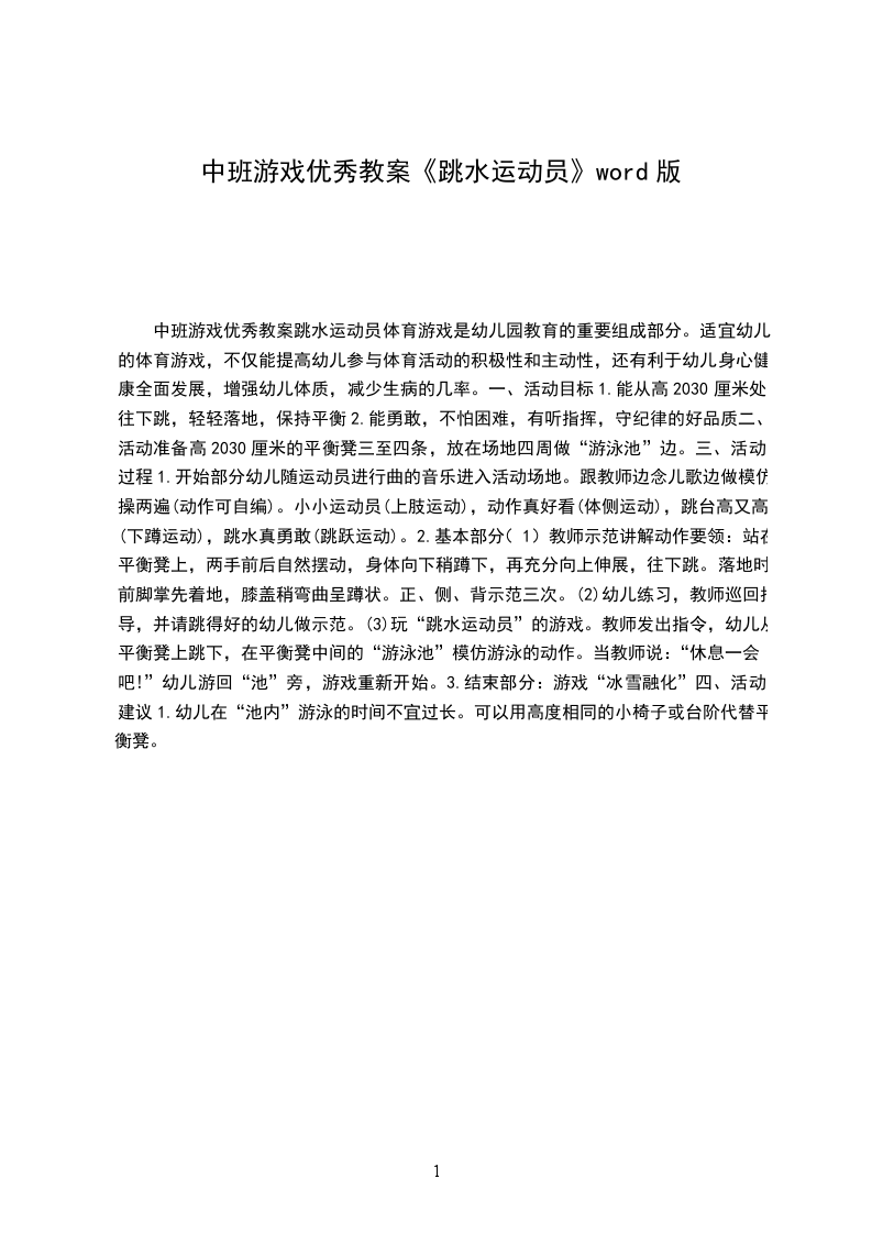中班游戏优秀教案跳水运动员体育游戏是幼儿园教育的重要组成部分。适宜幼儿的体育游戏,不仅能提高幼儿参与体育活动的积极性和主动性,还有利于幼儿身心健康全面发展,增强幼儿体质,减少生病的几率。