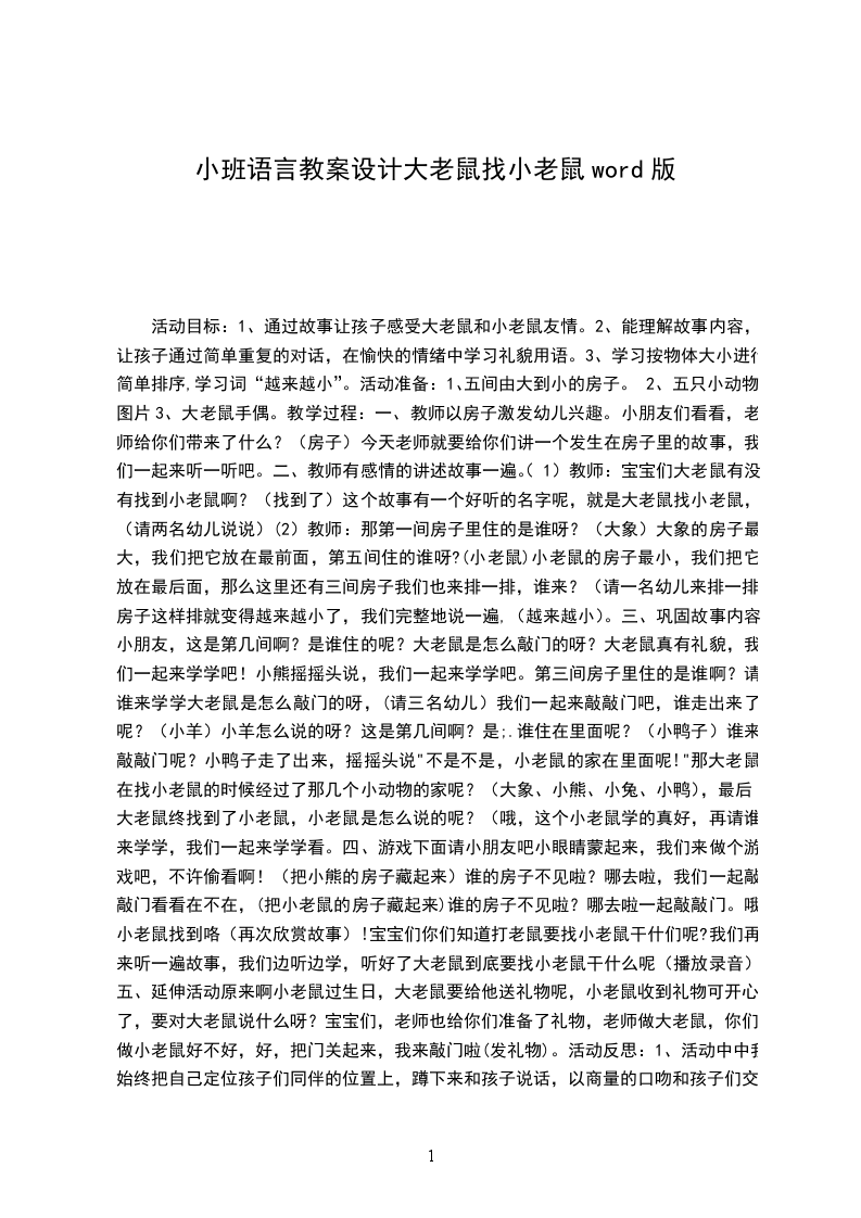 活动目标:1、通过故事让孩子感受大老鼠和小老鼠友情。