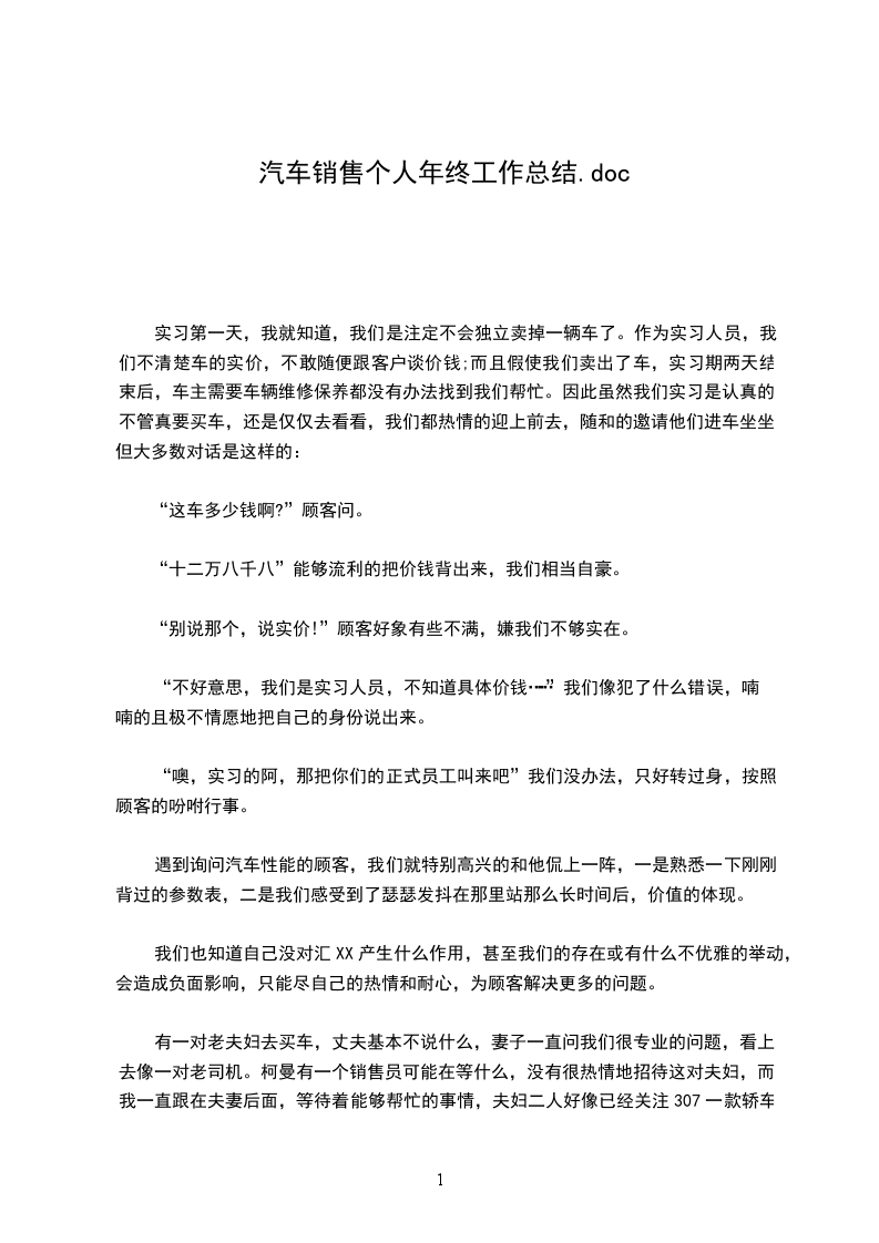 20__年即将过去,在今年的汽车销售期间,我通过努力的工作,也有了一点的收获,借此对自己的工作做一下总结,目的在于吸取教训,提高自己,以至于把工作做的更好,自己有信心也有决心把今后的工作做到更好。
