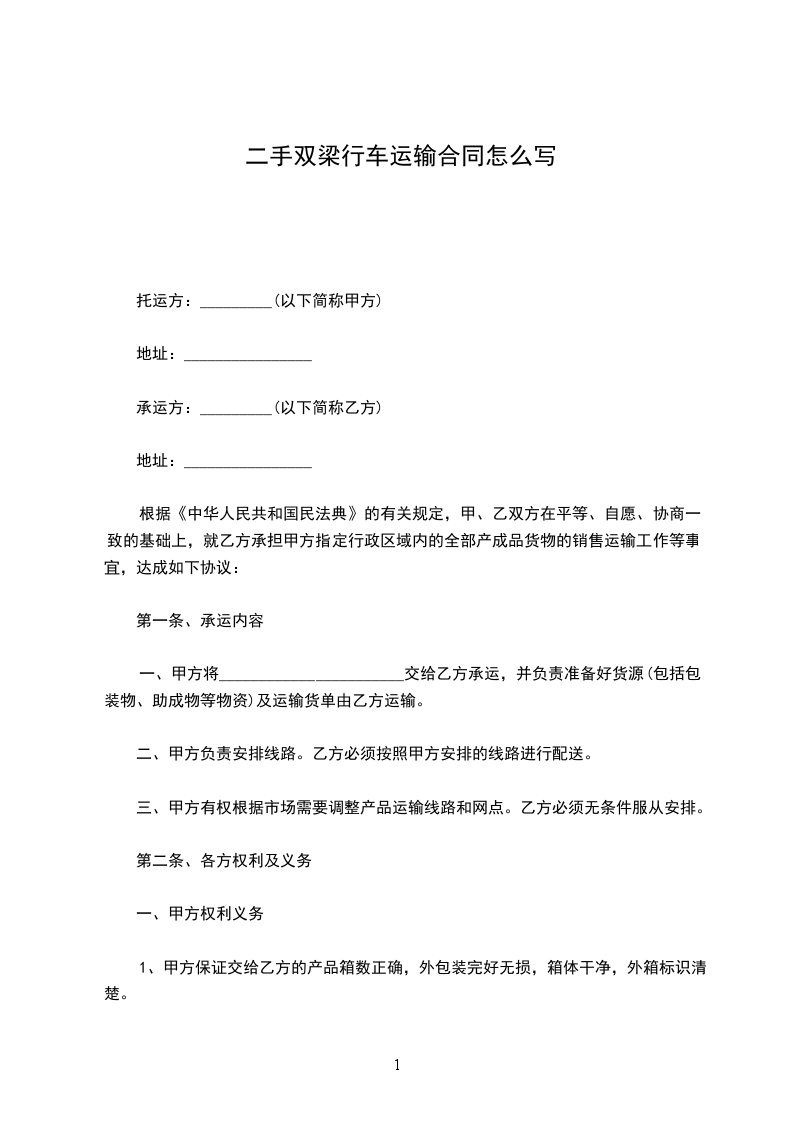 单梁行车车辆运输协议书