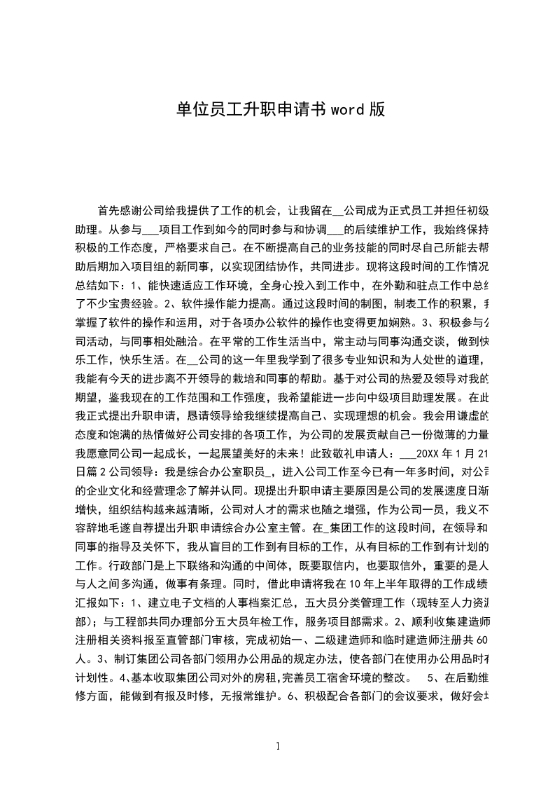 首先感谢公司给我提供了工作的机会,让我留在__公司成为正式员工并担任初级助理。从参与___项目工作到如今的同时参与和协调___的后续维护工作,我始终保持积极的工作态度,严格要求自己。在不断提高自己的业务技能的同时尽自己所能去帮助后期加入项目组的新同事,以实现团结协作,共同进步。现将这段时间的工作情况总结如下:1、能快速适应工作环境,全身心投入到工作中,在外勤和驻点工作中总结了不少宝贵经验。2、软件操作能力提高。通过这段时间的制图,制表工作的积累,我掌握了软件的操作和运用,对于各项办公软件的操作也变得更加娴熟。3、积极参与公司活动,与同事相处融洽。在平常的工作生活当中,常主动与同事沟通交谈,做到快乐工作,快乐生活。在__公司的这一年里我学到了很多专业知识和为人处世的道理,我能有今天的进步离不开领导的栽培和同事的帮助。基于对公司的热爱及领导对我的期望,鉴我现在的工作范围和工作强度,我希望能进一步向中级项目助理发展。在此我正式提出升职申请,恳请领导给我继续提高自己、实现理想的机会。我会用谦虚的态度和饱满的热情做好公司安排的各项工作,为公司的发展贡献自己一份微薄的力量。我愿意同公司一起成长,一起展望美好的未来!此致敬礼申请人:___20XX年1月21日篇2公司领导:我是综合办公室职员_,进入公司工作至今已有一年多时间,对公司的企业文化和经营理念了解并认同。现提出升职申请主要原因是公司的发展速度日渐增快,组织结构越来越清晰,公司对人才的需求也随之增强,作为公司一员,我义不容辞地毛遂自荐提出升职申请综合办公室主管。在_集团工作的这段时间,在领导和同事的指导及关怀下,我从盲目的工作到有目标的工作,从有目标的工作到有计划的工作。行政部门是上下联络和沟通的中间体,既要取信内,也要取信外,重要的是人与人之间多沟通,做事有条理。同时,借此申请将我在10年上半年取得的工作成绩汇报如下:1、建立电子文档的人事档案汇总,五大员分类管理工作(现转至人力资源部);与工程部共同办理部分五大员年检工作,服务项目部需求。2、顺利收集建造师注册相关资料报至直管部门审核,完成初始