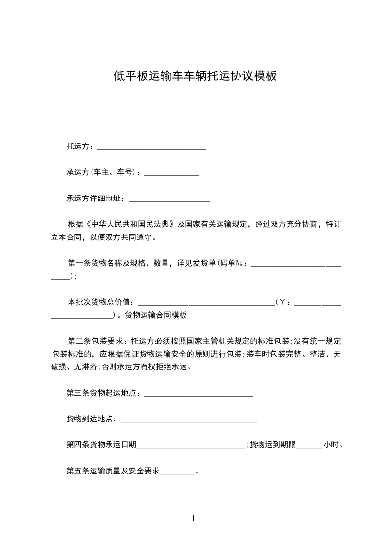 低平板运输车车辆托运协议模板