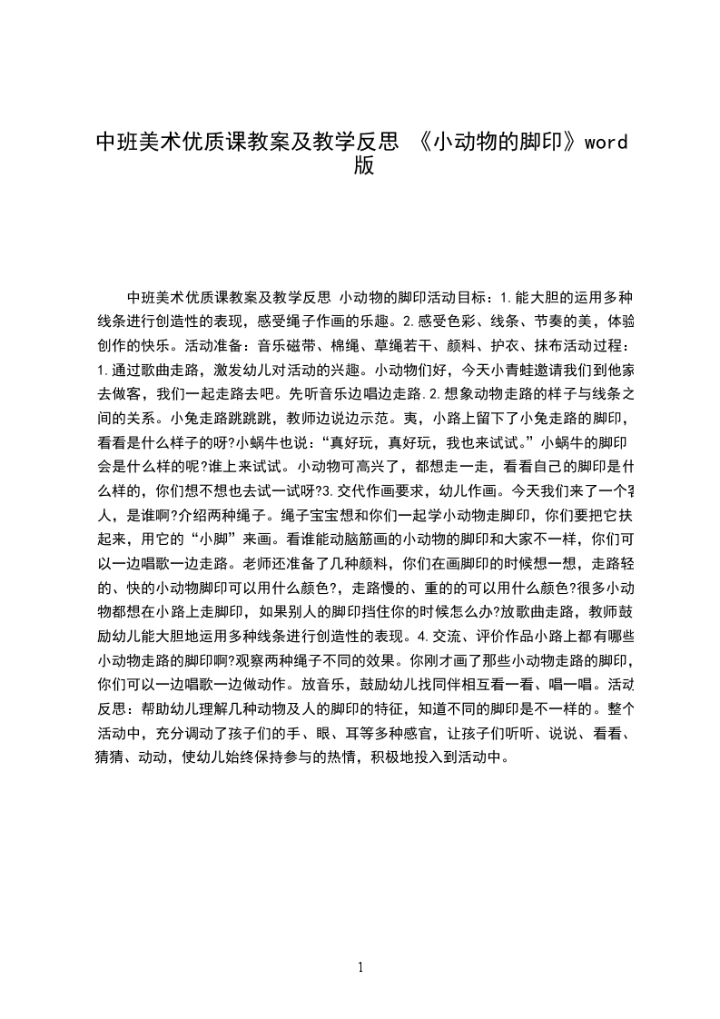 4.交流、评价作品小路上都有哪些小动物走路的脚印啊?观察两种绳子不同的效果。你刚才画了那些小动物走路的脚印,你们可以一边唱歌一边做动作。放音乐,鼓励幼儿找同伴相互看一看、唱一唱。活动反思:帮助幼儿理解几种动物及人的脚印的特征,知道不同的脚印是不一样的。整个活动中,充分调动了孩子们的手、眼、耳等多种感官,让孩子们听听、说说、看看、猜猜、动动,使幼儿始终保持参与的热情,积极地投入到活动中。