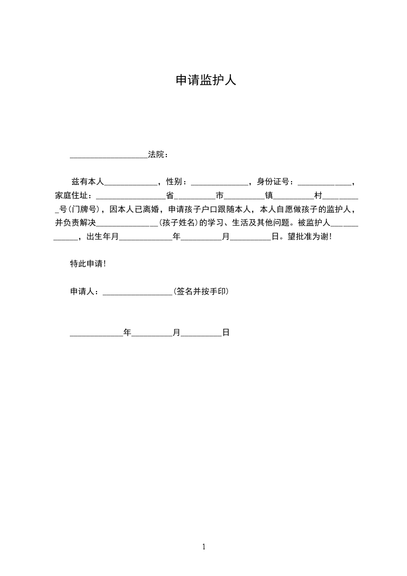 兹有本人_____________,性别:______________,身份证号:_____________,家庭住址:_________________省__________市__________镇__________村__________号,因本人已离婚,申请孩子户口跟随本人,本人自愿做孩子的监护人,并负责解决_______________的学习、生活及其他问题。被监护人_____________,出生年月:_______年_______月_______日。望批准为谢!