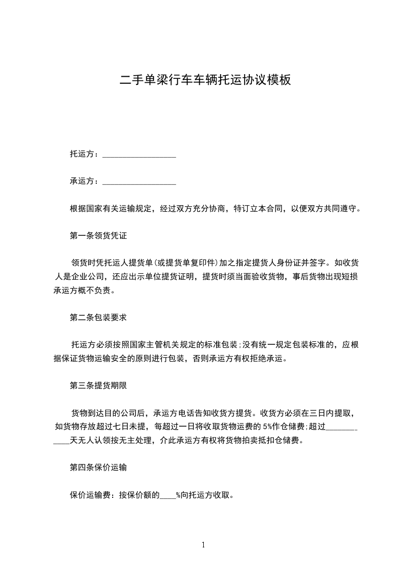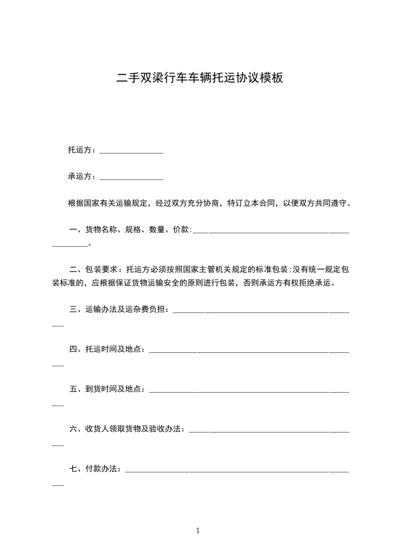 一、甲方委托乙方运输________________________,运输方式为__________________运输。货物起始点为______,到货地点为______由甲方指定收货人签收。