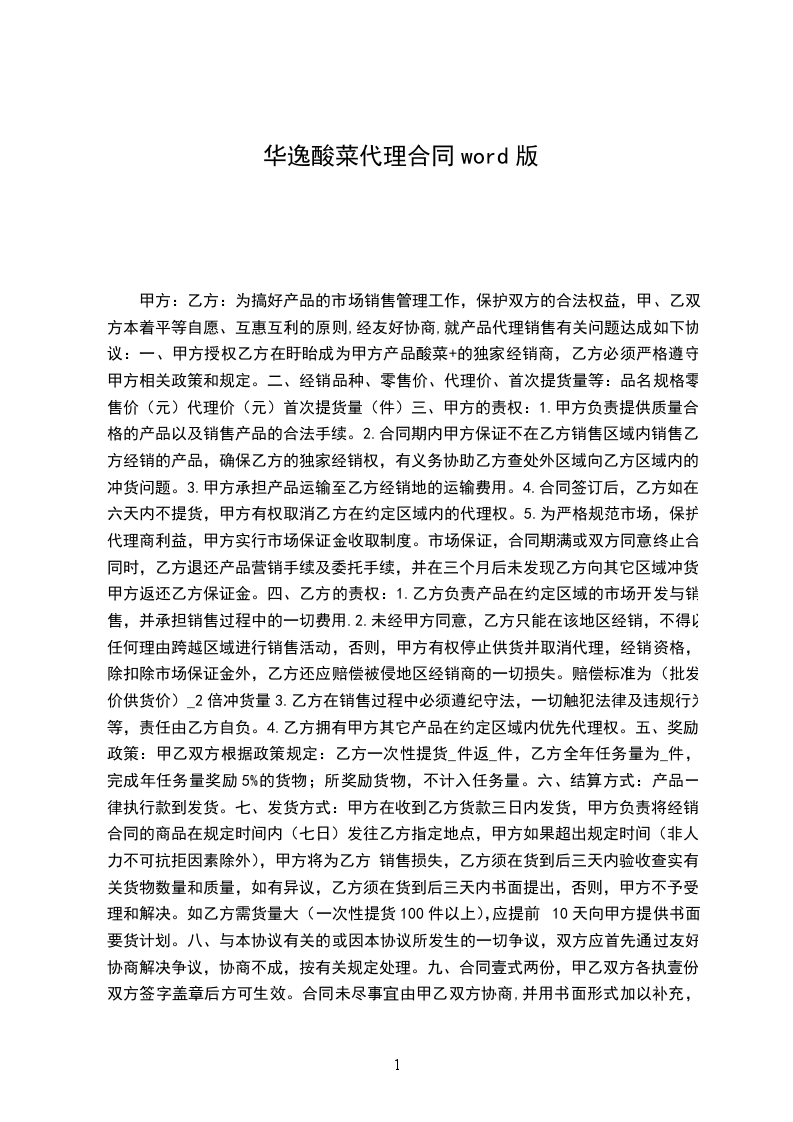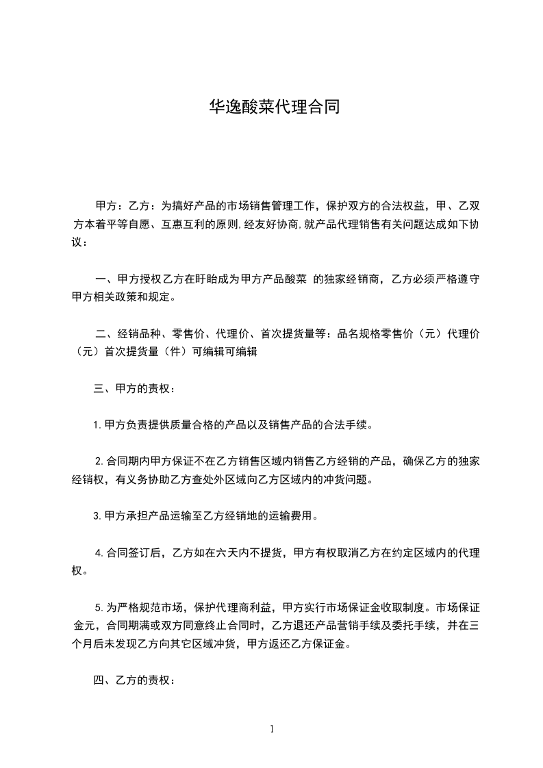 一、甲方授权乙方在盱眙成为甲方产品酸菜+的独家经销商,乙方必须严格遵守甲方相关政策和规定。