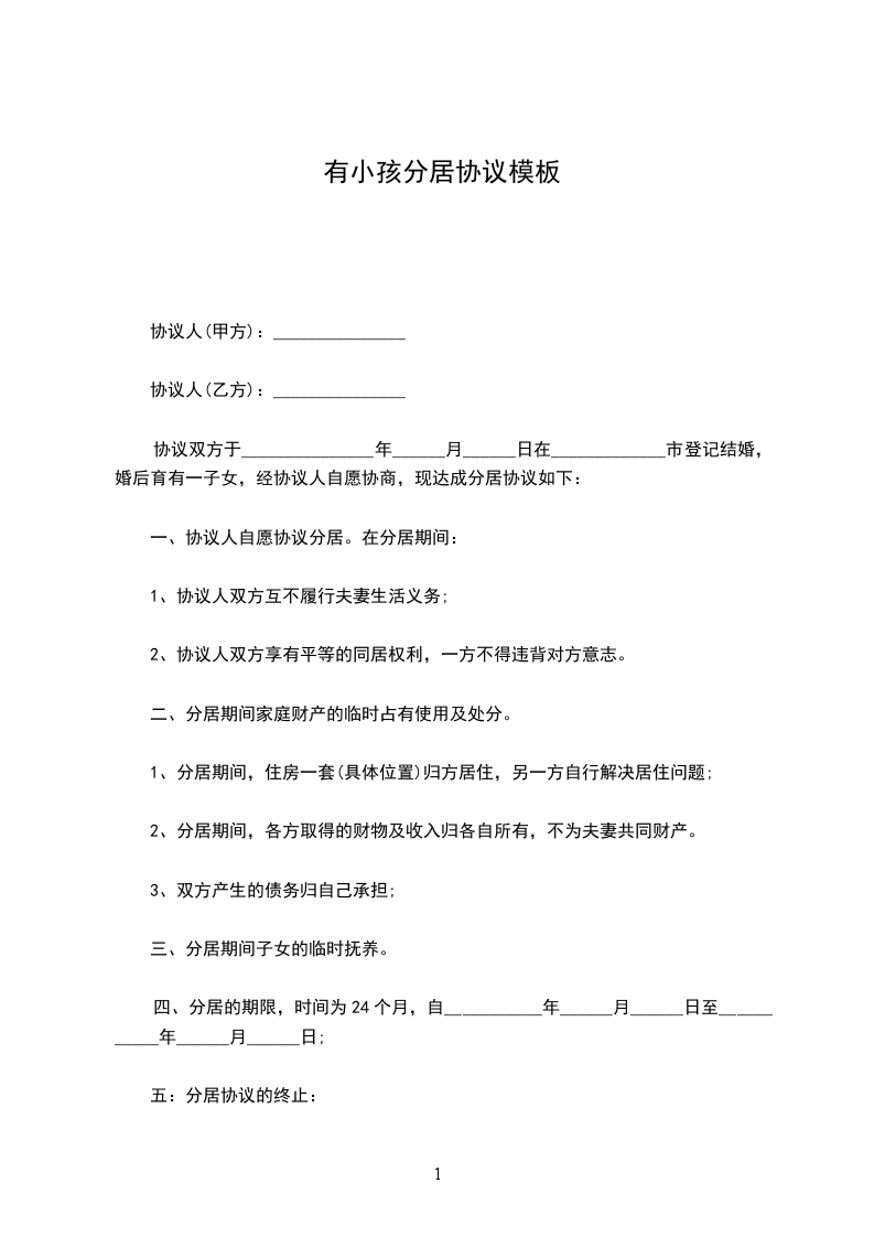 协议双方于_______________年______月______日在_____________市登记结婚,婚后育有一子女,经协议人自愿协商,现达成分居协议如下: