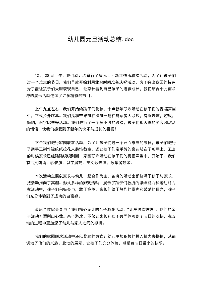 20__年12月31日早上,我们班举行了“庆元旦贺新年”亲子文体活动。本次活动得到了家长们的大力支持,活动搞得很成功,我了有以下几点: