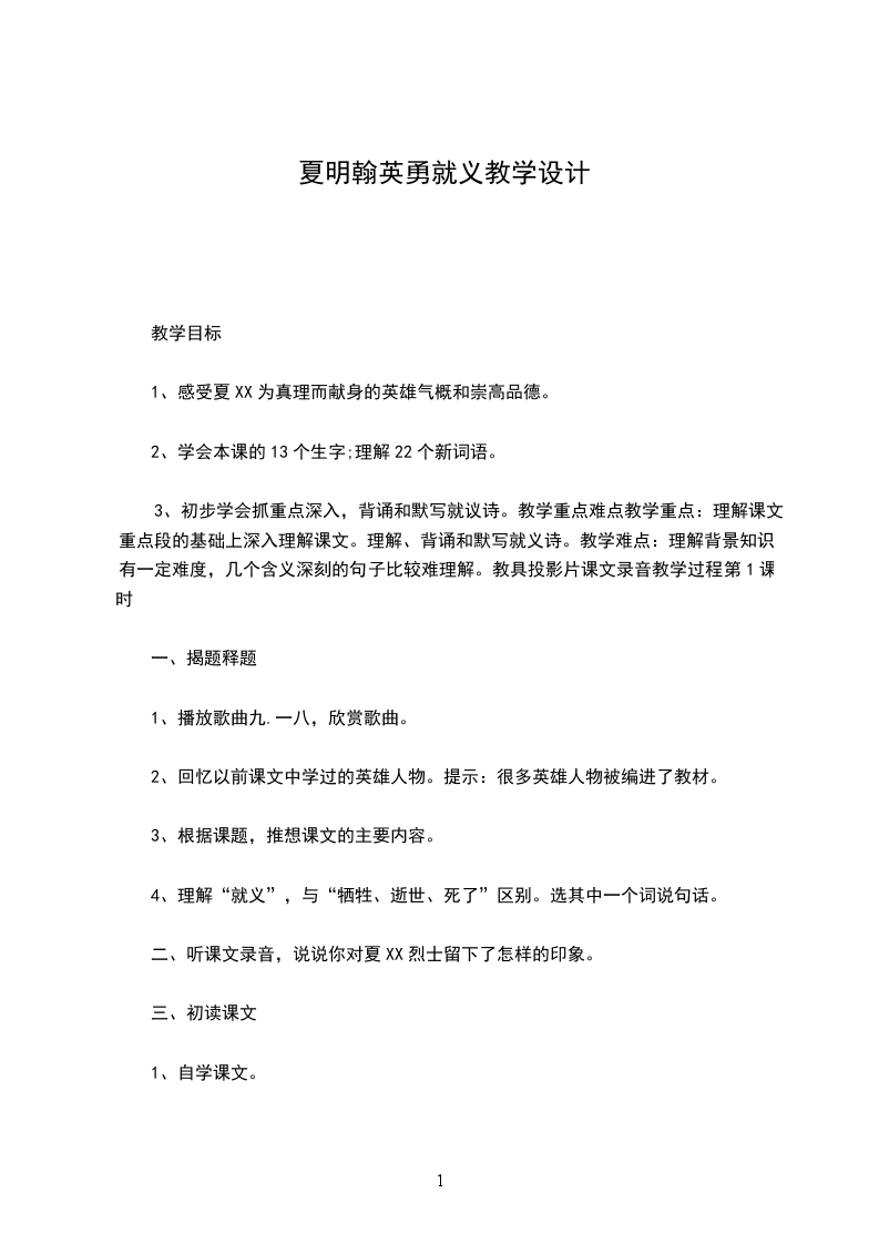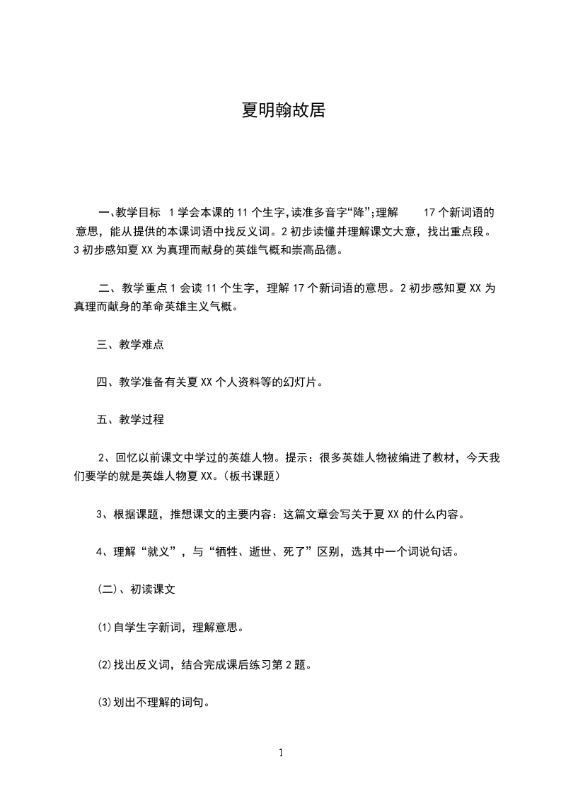 二、教学重点1会读11个生字,理解17个新词语的意思。2初步感知夏XX为真理而献身的革命英雄主义气概。