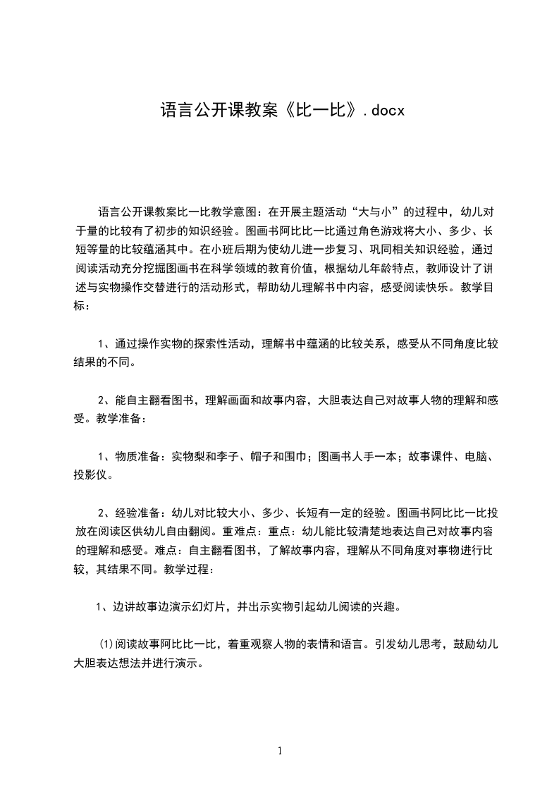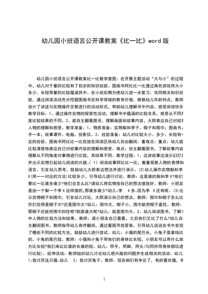三、幼儿观察,比较物体幼儿操作,比一比。开始,我通过观察大书封面,猜测故事内容,引起幼儿兴趣。在理解故事的过程中,我分段让幼儿欣赏,并在分段欣赏时发准相近字音、理解相应词汇。在理解每段内容的时候我还让幼儿进行简单的“比一比”,感受故事中的情境。幼儿在“比一比”的过程中情绪很高涨,很快就理解了词汇“多少、大小、长短”。