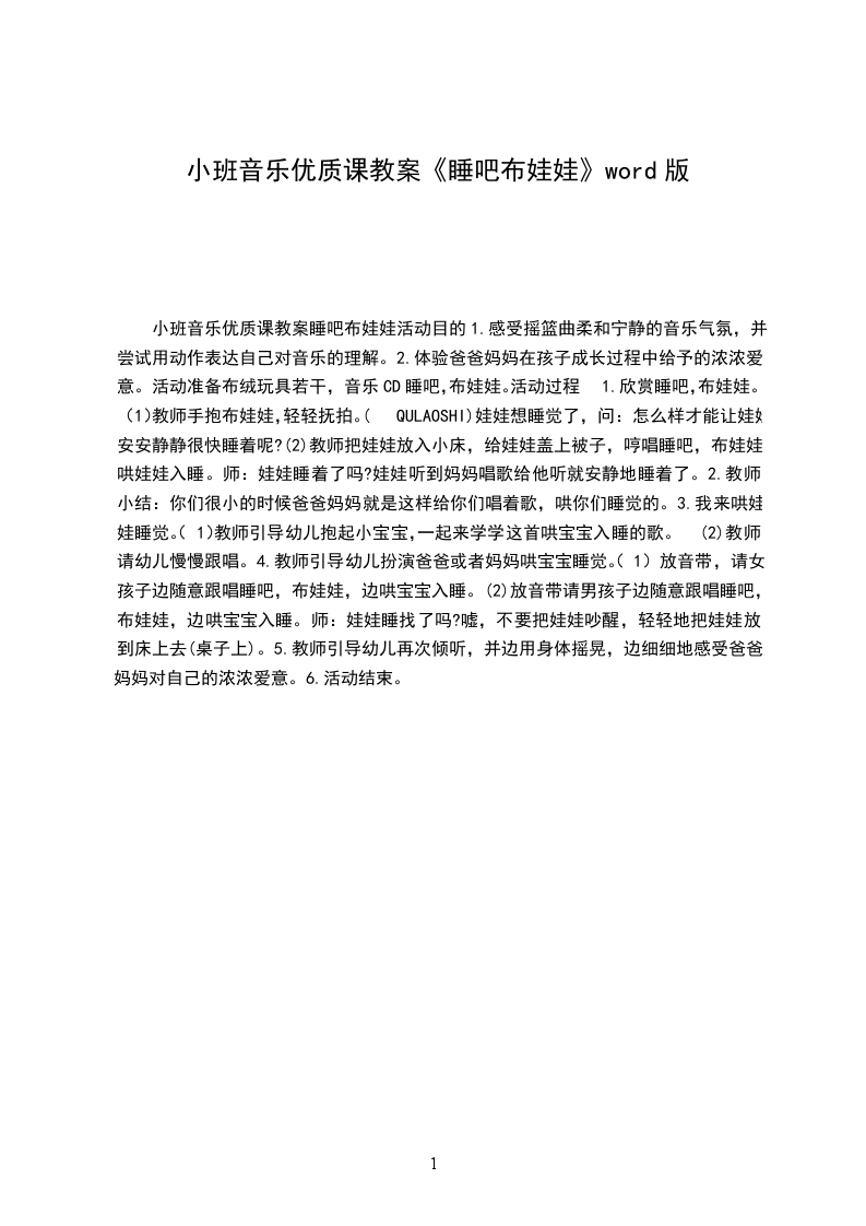 小班音乐优质课教案睡吧布娃娃活动目的1.感受摇篮曲柔和宁静的音乐气氛,并尝试用动作表达自己对音乐的理解。