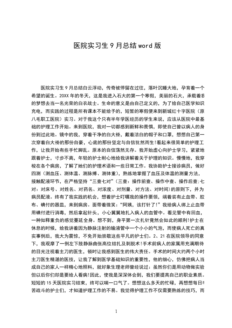 医院实习生9月总结白云浮动,传奇被停留在过往,落叶沉睡大地,孕育着一个希望的诞生。20XX年的冬天,这是我进入石大的第一个寒假,美丽的石大,承载着我的梦想去当一名光荣的白衣战士。生命的意义是由自己定义的,为了给自己医学知识充电,而实践的过程是所有课本不能给予的,短暂的寒假便来到新城红十字医院(原八毛职工医院)实习。对于我这个只有半年学医经历的学生来说,应该从医院中最基础的护理工作开始。来到医院,我对一切都感到新鲜和畏惧,即使自己曾以病人的身份到过此地。镜中的我,穿着干净的白大褂,戴着洁白的帽子和口罩,想想自己第一次穿着白大褂的那份自豪,心底的那份坚定与自信犹然而生!看起来很简单的护理工作,让我开始有些手忙脚乱。原本的自信荡然无存。我开始虚心向护士学习,紧紧地跟着护士,寸步不离,年轻的护士耐心地给我讲解着关于护理的知识。慢慢地,我穿梭在各个病房,了解了她们的护理术语和一些日常工作。我协助护士接诊病员,做好四测(测血压、测体温、测脉搏、测体重),熟练地掌握了血压及体温的测量方法,接触配液环节,在严格坚持“三查七对”(三查:操作前查、操作中查、操作后查;七对:对床号、对姓名、对药名、对浓度、对剂量、对方法、对时间)的原则下,并为病员配液。终有了我实践的机会,想着护士叮嘱我的操作要领,端着装有止血带、胶布、碘付的器皿,来到病房。面带着微笑:“阿姨,该打针了!”我给病人绑上止血带,用碘付进行消毒,然后拿起针头,小心翼翼地扎入病人的血管中。看见管中有回血,一种如释重负的感觉蔓延全身。想不到,身平第一次扎针竟然会如此的顺利!护士在休息的时候,给我讲着因为静脉注射的输液管中一个小小的气泡,而使病人死亡的真实事例后,我大为震惊,不免开始崇敬这些平凡的护士们。2、21在医院领导的同意下,我观摩了一例左下肢静脉曲张高位结扎及剥脱术!手术前病人的家属用充满期待的目光注视着主刀的医生,顿时让我感到医生的伟大责任。手术的时间大约两个小时,主刀医生精湛的医技,让我了解到医学基础知识的重要性,他的细心,仿佛把病人当成自己的家人一样精心地照料,就好象生理老师曾经说过:虽然你们是用动物做实验,但以后你们却是要给人看病!因此,使我是深深体会到,我们要提高自己的职业素质。短短的15天医院实习结束,终可以喘一口气了。想想这么多天的忙碌,再想想每日辛苦战斗的护士们,才知道护理工作的不易。我觉得护理工作不仅需要熟练的技巧,而且同样需要优秀的职业素质: