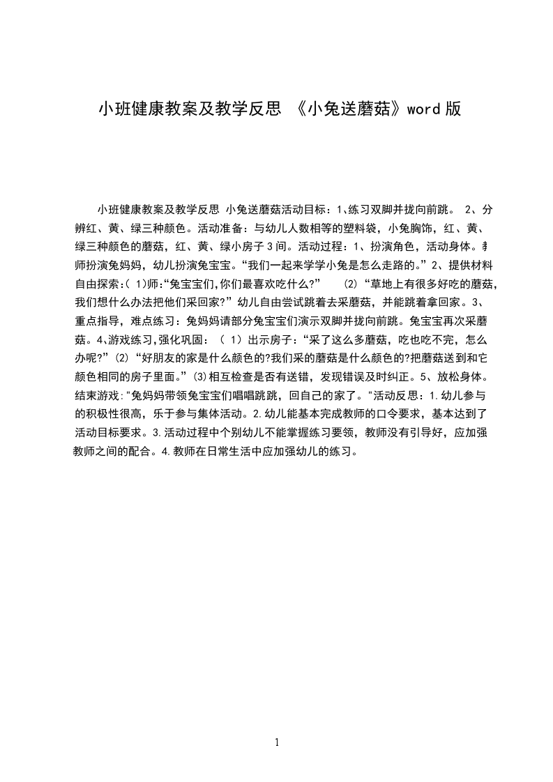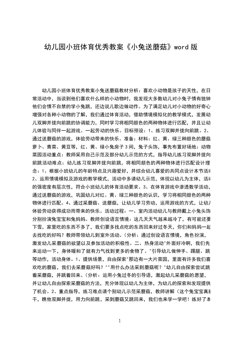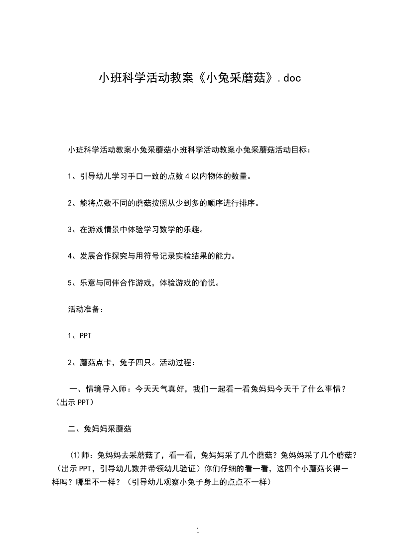 一、室内活动幼儿与教师戴上小兔头饰,分别扮演兔宝宝和兔妈妈。教师创设语言情境:这几天天气越来越冷了,有可能还要下雪,家里吃的东西不多了,我们要多找点吃的东西回来好过冬天,你们和妈妈一起去找吃的好吗?教师带领幼儿到室外活动。(分析:通过创设语言情境,角色扮演,激发幼儿采蘑菇的欲望以及参加活动的积极性。