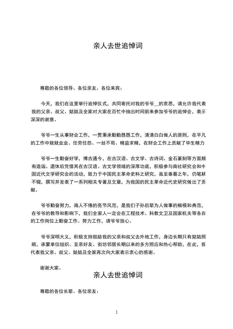 亲人去世追悼词