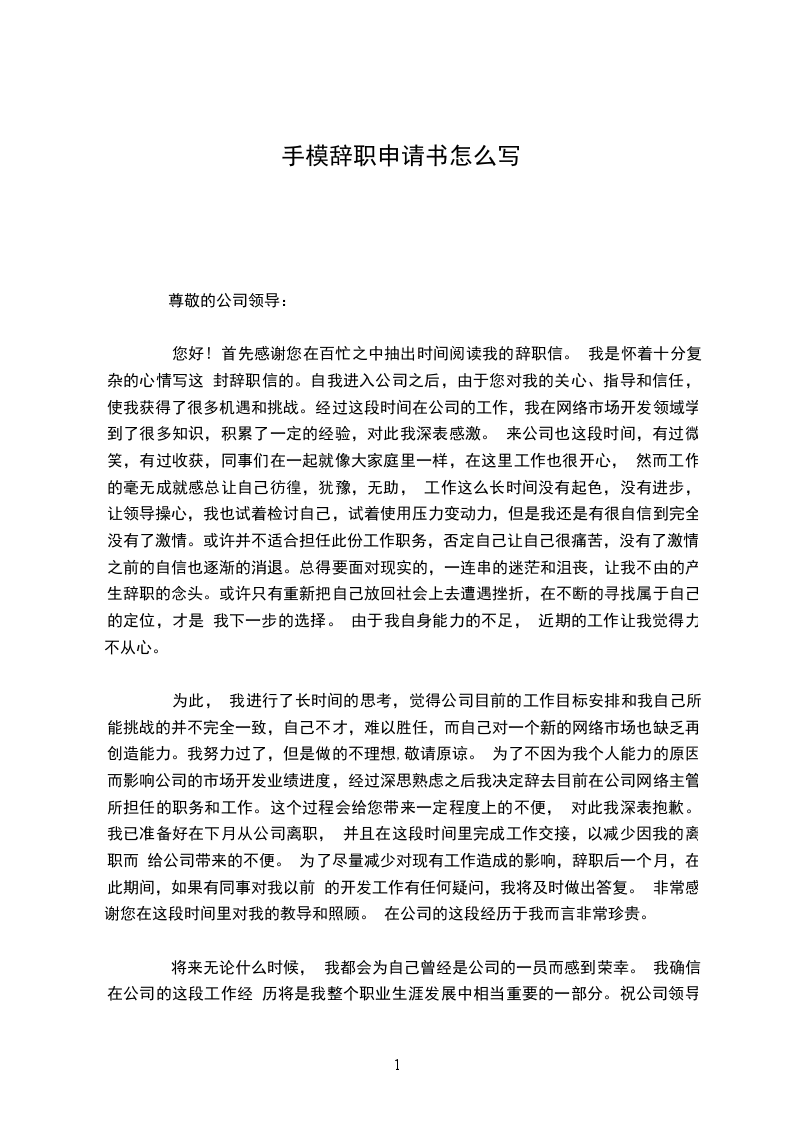 为此, 我进行了长时间的思考,觉得公司目前的工作目标安排和我自己所能挑战的并不完全一致,自己不才,难以胜任,而自己对一个新的网络市场也缺乏再创造能力。我努力过了,但是做的不理想,敬请原谅。 为了不因为我个人能力的原因而影响公司的市场开发业绩进度,经过深思熟虑之后我决定辞去目前在公司网络主管所担任的职务和工作。这个过程会给您带来一定程度上的不便, 对此我深表抱歉。我已准备好在下月从公司离职, 并且在这段时间里完成工作交接,以减少因我的离职而 给公司带来的不便。 为了尽量减少对现有工作造成的影响,辞职后一个月,在此期间,如果有同事对我以前 的开发工作有任何疑问,我将及时做出答复。 非常感谢您在这段时间里对我的教导和照顾。 在公司的这段经历于我而言非常珍贵。