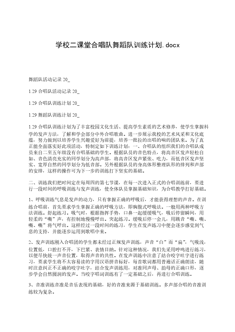 一、指导思想:学校合唱队是课外音乐活动中较庞大的活动集体,其目的是培养学生对音乐的兴趣爱好,丰富学校课外文化生活,促进学生身心健康发展,对其开拓音乐视野,丰富他们的音乐知识,提高技能技巧和音乐素养。在学校这个大的集体中,歌唱模块中合唱的训练就显得非常重要,它不仅是歌唱本身的愉悦心情的体验,并使有音乐特长的学生充分发展,在活动中发挥他们的主动性,独立性和创造性,又可培养学生的集体创作精神。