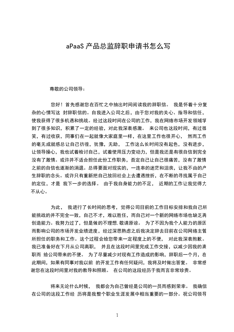为此, 我进行了长时间的思考,觉得公司目前的工作目标安排和我自己所能挑战的并不完全一致,自己不才,难以胜任,而自己对一个新的网络市场也缺乏再创造能力。我努力过了,但是做的不理想,敬请原谅。 为了不因为我个人能力的原因而影响公司的市场开发业绩进度,经过深思熟虑之后我决定辞去目前在公司网络主管所担任的职务和工作。这个过程会给您带来一定程度上的不便, 对此我深表抱歉。我已准备好在下月从公司离职, 并且在这段时间里完成工作交接,以减少因我的离职而 给公司带来的不便。 为了尽量减少对现有工作造成的影响,辞职后一个月,在此期间,如果有同事对我以前 的开发工作有任何疑问,我将及时做出答复。 非常感谢您在这段时间里对我的教导和照顾。 在公司的这段经历于我而言非常珍贵。