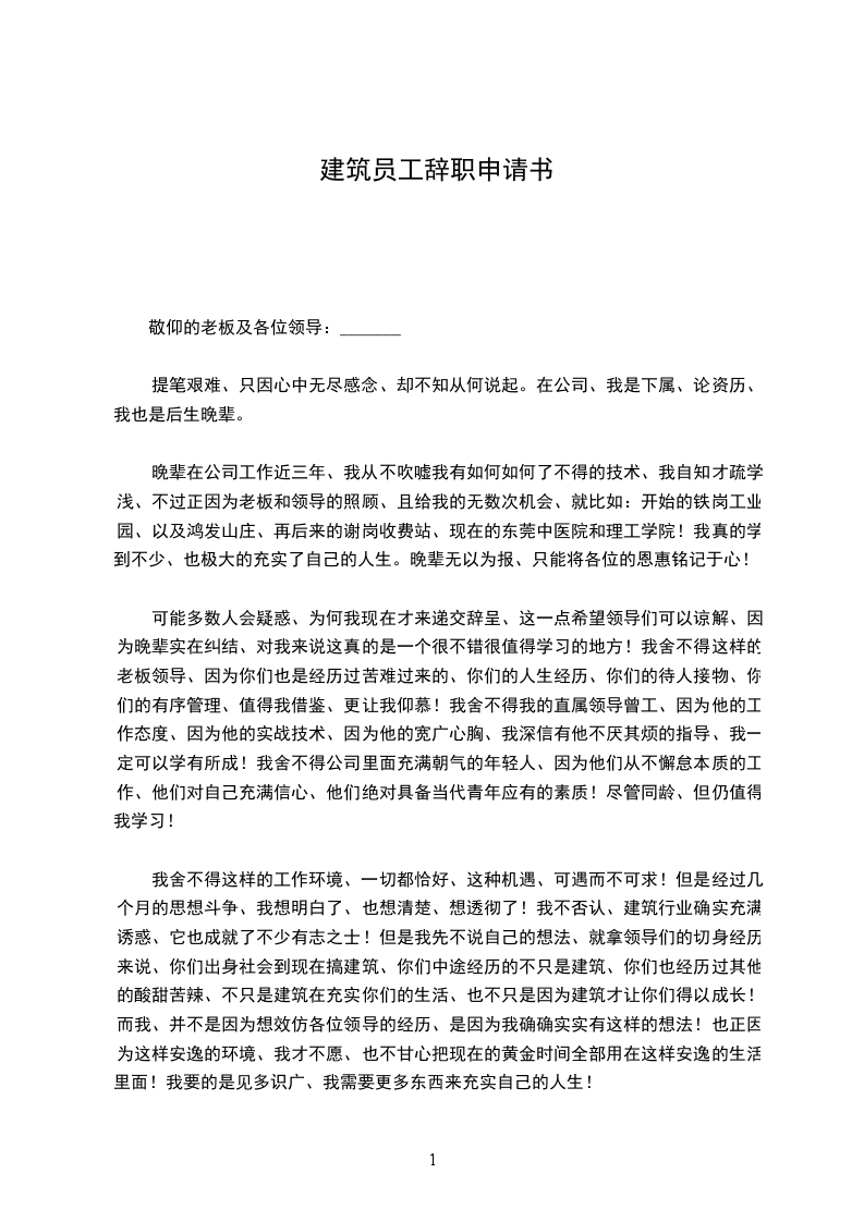 在过去的___里,公司给予了我良好的学习和锻炼机会,学到了一些新的东西充实了自己,增加了自己的一些知识和实践经验。我对于公司的照顾表示真心的感谢!今天我选择离开并不是我对现在的工作畏惧,承受能力不行。经过慎重的思考,我发现在公司的工作离我的职业目标渐行渐远。人如果偏离了自己的职业目标,那剩下的光阴只会虚度一生,碌碌无为,不会给公司带来任何价值,相信公司领导能给予充分的谅解。