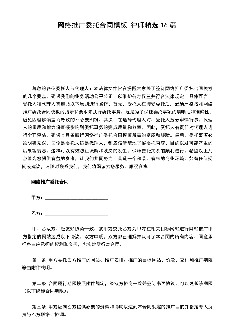 甲、乙双方,经友好协商一致,就甲方委托乙方为甲方在相关目标网站进行网站推广甲方指定的网站达成以下协议。双方申明,双方都已理解并认可了本合同的所有内容,同意承担各自应承担的权利和义务,忠实地履行本合同。