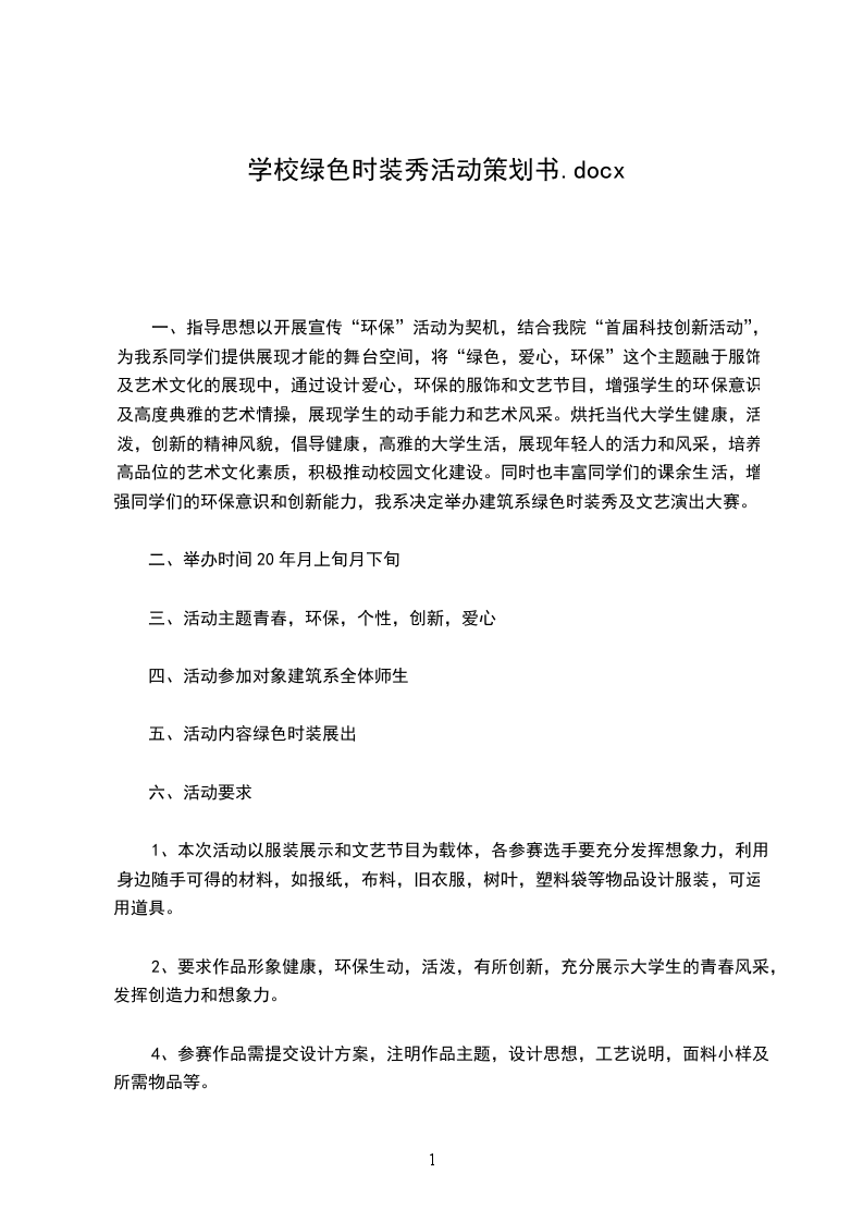 以开展宣传“环保”活动为契机,结合我院“首届科技创新活动”,为我系同学们提供展现才能的舞台空间,将“绿色,爱心,环保”这个主题融于服饰及艺术文化的展现中,通过设计爱心,环保的服饰和文艺节目,增强学生的环保意识及高度典雅的艺术情操,展现学生的动手能力和艺术风采;烘托当代大学生健康,活泼,创新的精神风貌,倡导健康,高雅的大学生活,展现年轻人的活力和风采,培养高品位的艺术文化素质,积极推动校园文化建设。同时也丰富同学们的课余生活,增强同学们的环保意识和创新能力,我系决定举办建筑系绿色时装秀及文艺演出大赛青春,环保,个性,创新,爱心建筑系全体师生绿色时装展出1,本次活动以服装展示和文艺节目为载体,各参赛选手要充分发挥想象力,利用身边随手可得的材料,如报纸,布料,旧衣服,树叶,塑料袋等物品设计服装,可运用道具。2,要求作品形象健康,环保生动,活泼,有所创新,充分展示大学生的青春风采,发挥创造力和想象力。4,参赛作品需提交设计方案,注明作品主题,设计思想,工艺说明,面料小样及所需物品等。5,每套系列作品准备半分钟解说词(100字内)文艺节目需交纳台词。6,自定模特要求:必须是我校在读的自信,乐观,大方积极,形象好的大学生,男生身高168厘米以上,女生身高158厘米以上.
