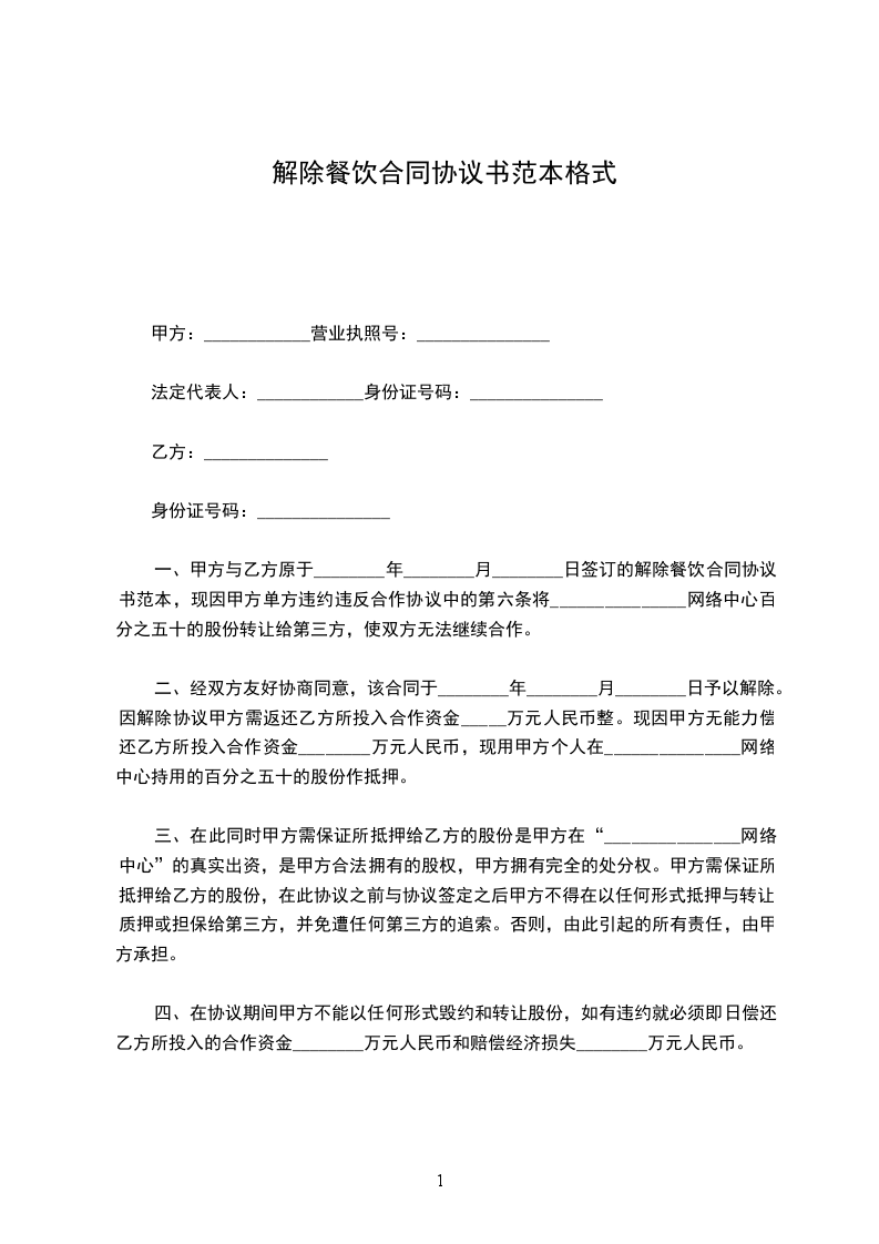 一、甲方与乙方原于________年________月________日签订的解除餐饮合同协议书范本,现因甲方单方违约违反合作协议中的第六条将_______________网络中心百分之五十的股份转让给第三方,使双方无法继续合作。