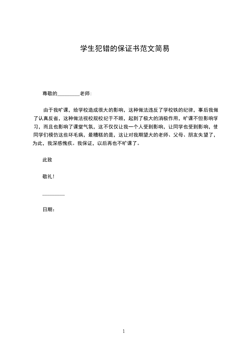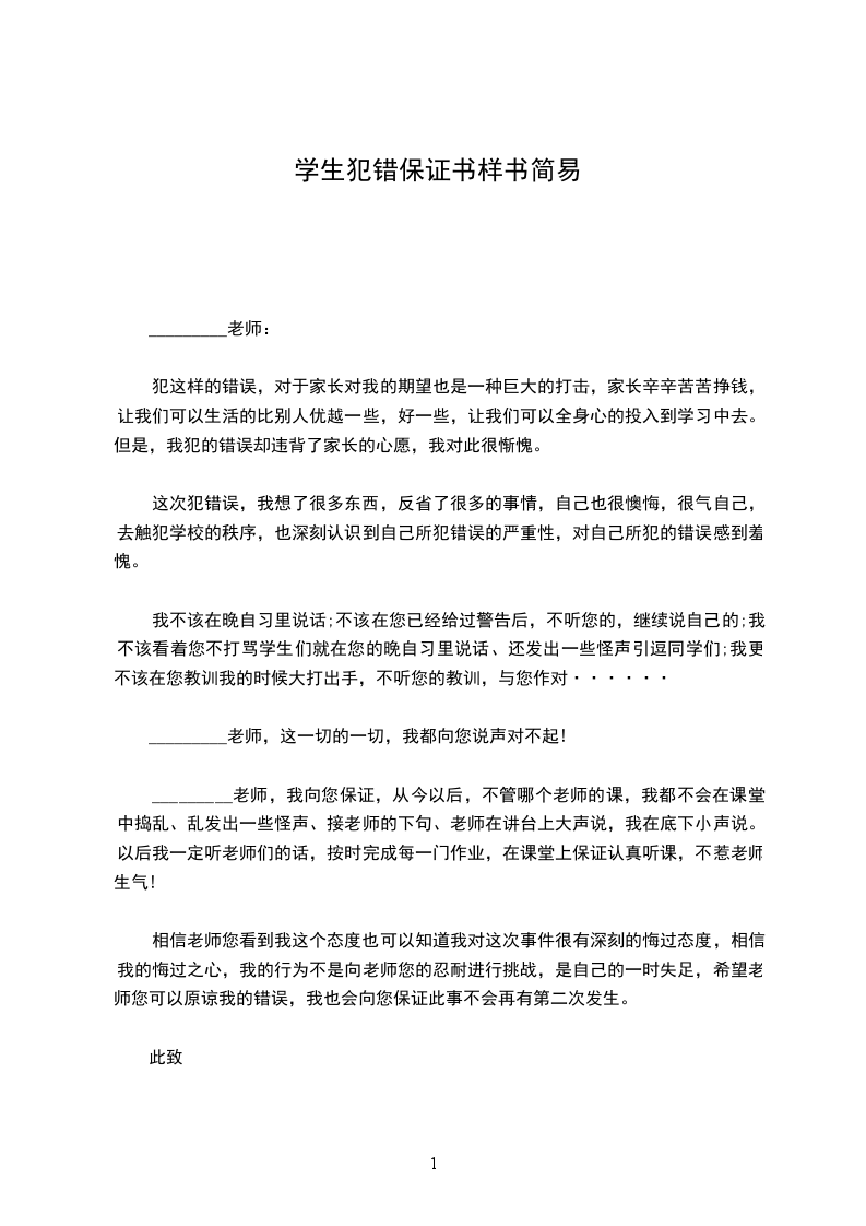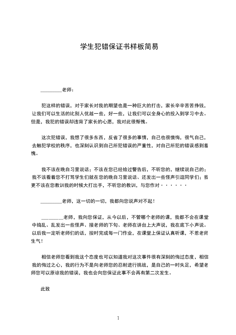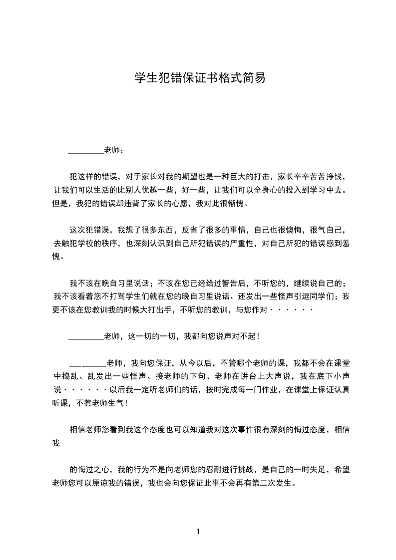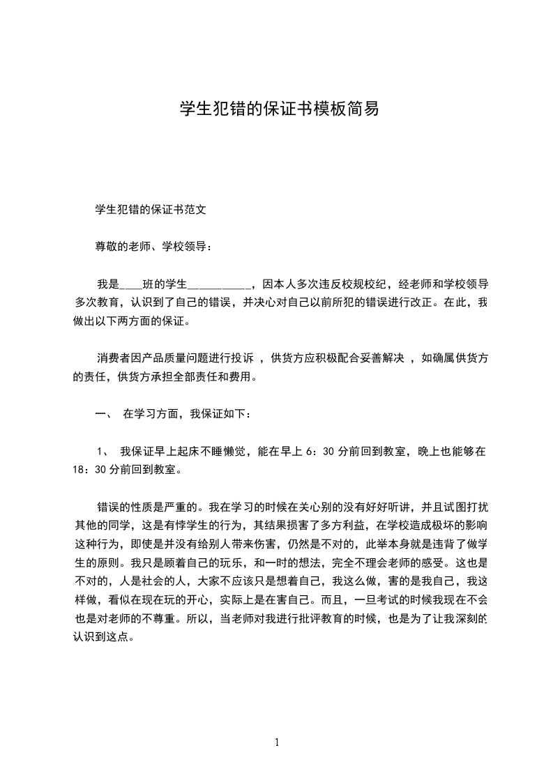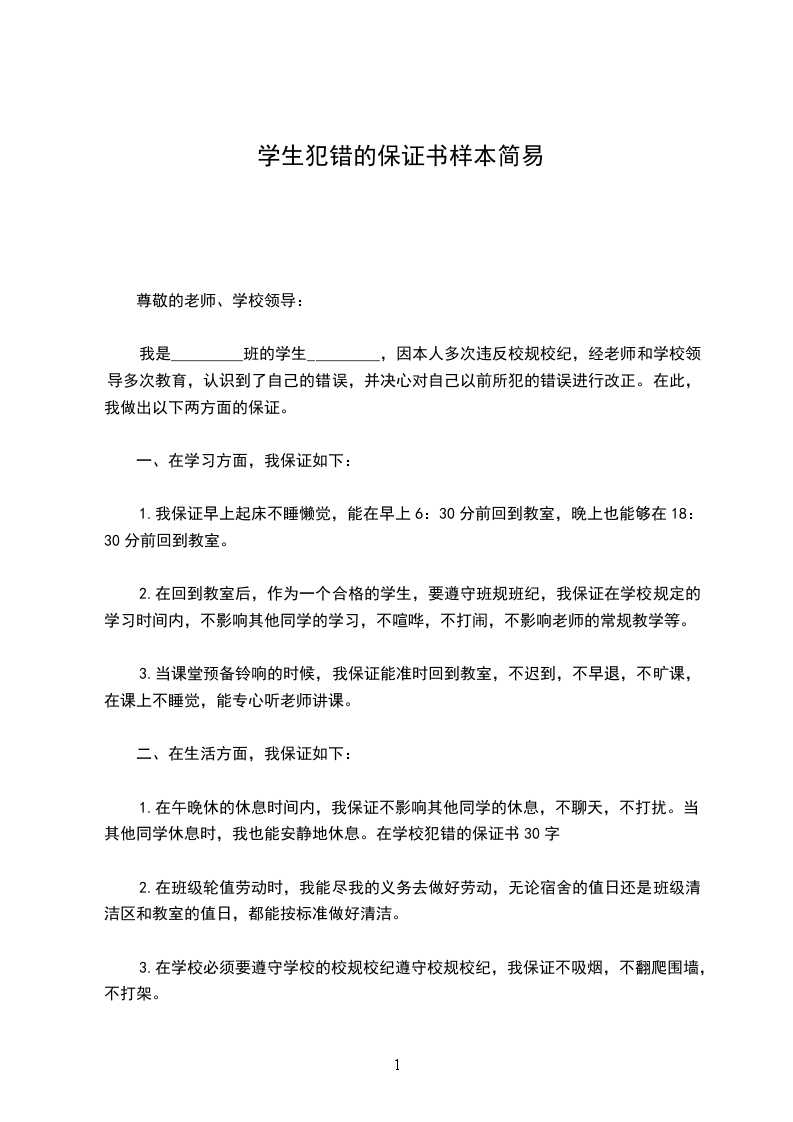 我是_________班的学生_________,因本人多次违反校规校纪,经老师和学校领导多次教育,认识到了自己的错误,并决心对自己以前所犯的错误进行改正。在此,我做出以下两方面的保证。