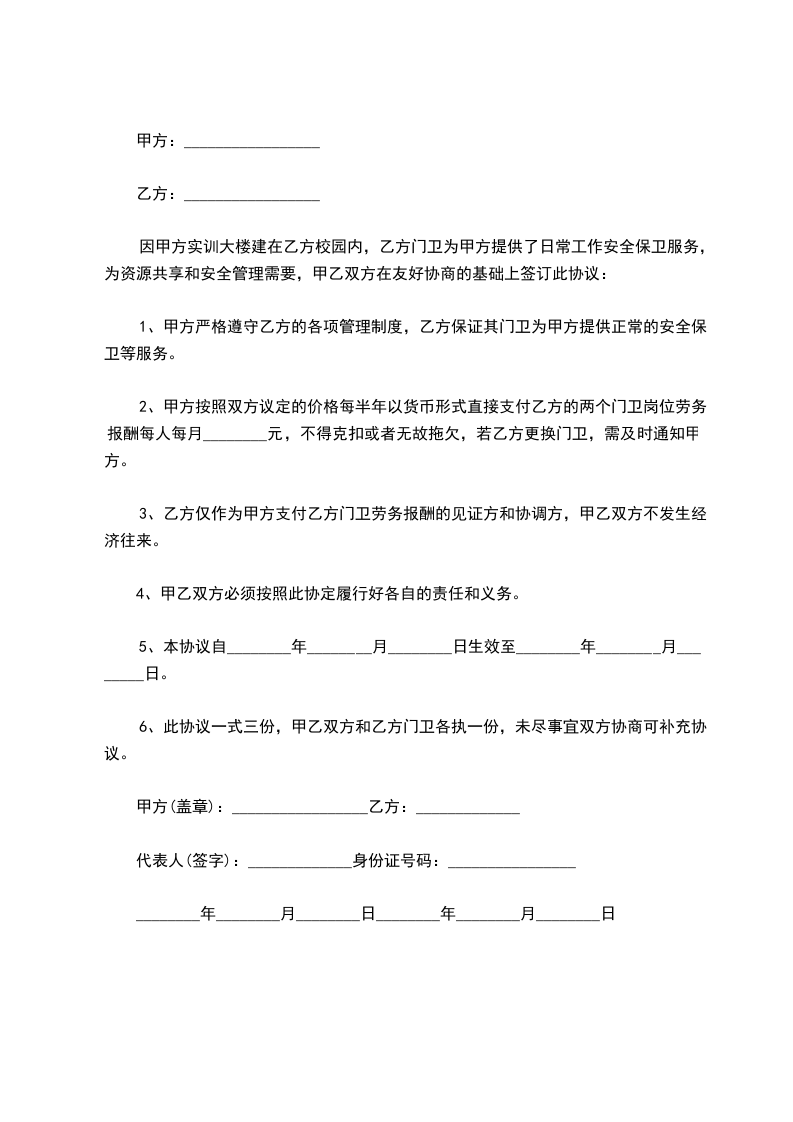 因甲方实训大楼建在乙方校园内,乙方门卫为甲方提供了日常工作安全保卫服务,为资源共享和安全管理需要,甲乙双方在友好协商的基础上签订此协议: