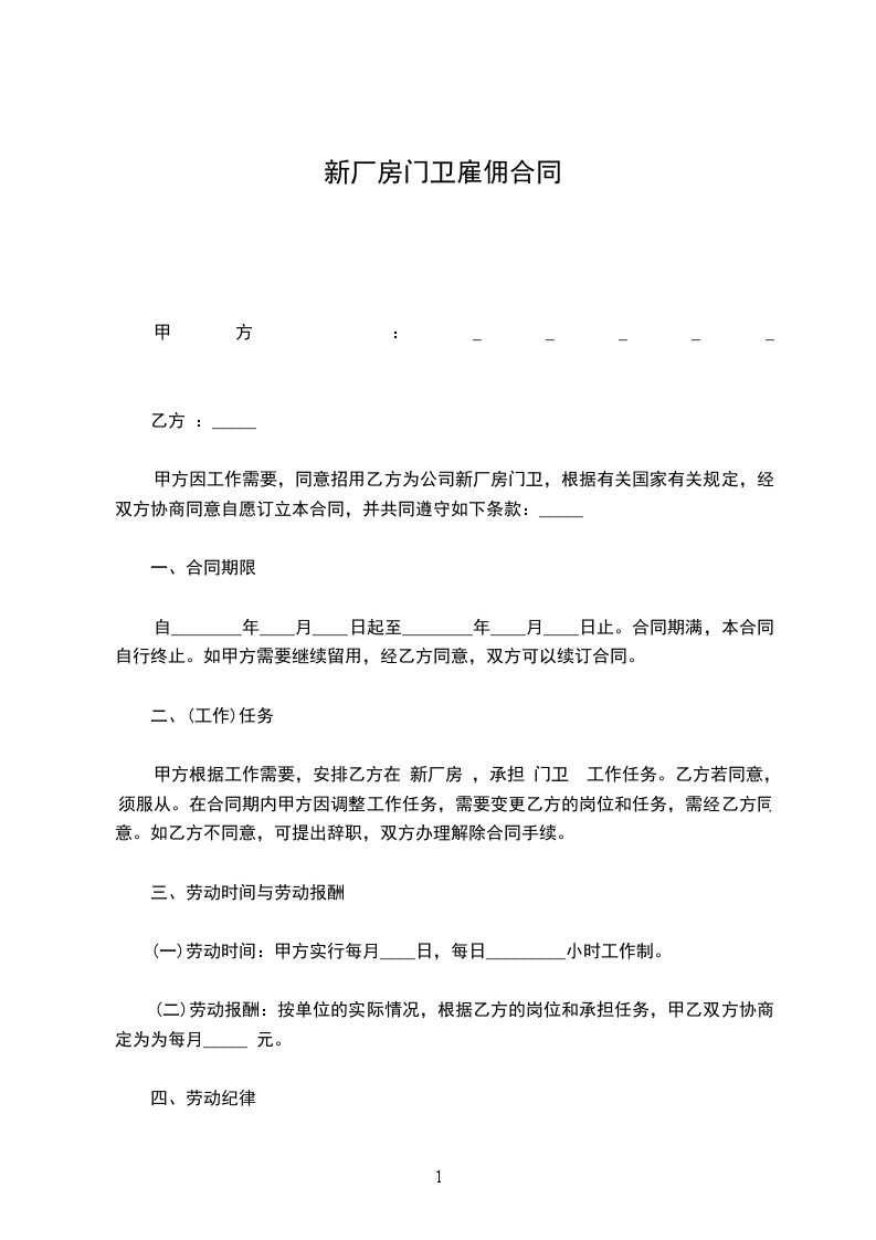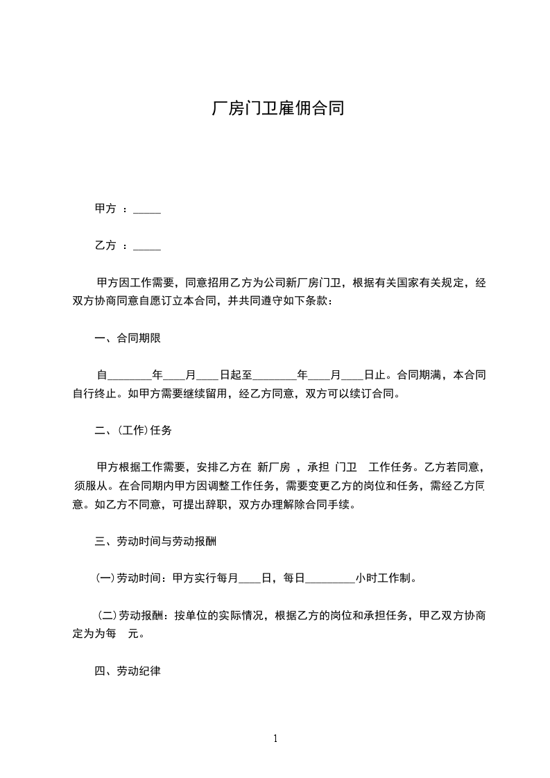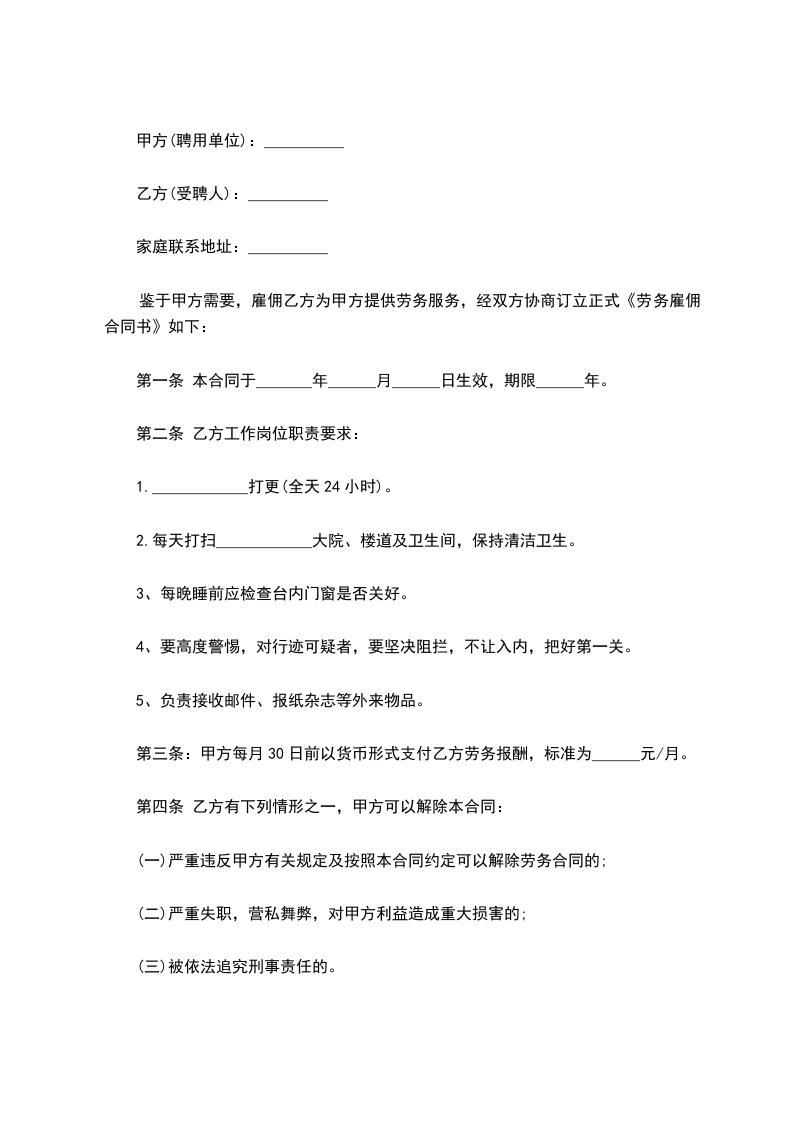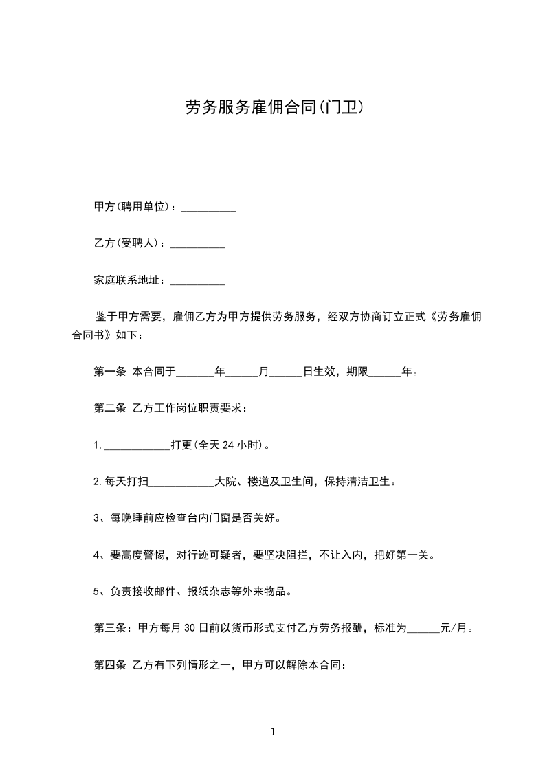 2、甲方按照双方议定的价格每半年以货币形式直接支付乙方的两个门卫岗位劳务报酬每人每月________元,不得克扣或者无故拖欠,若乙方更换门卫,需及时通知甲方。