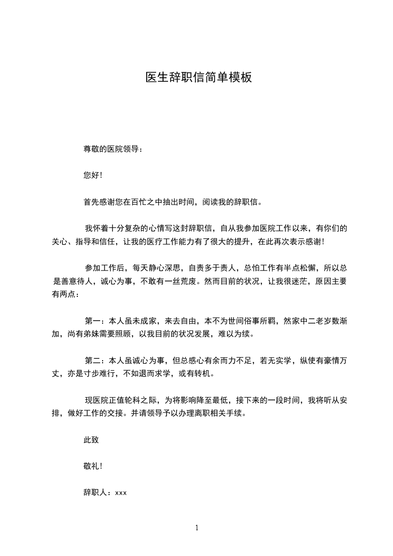 现医院正值轮科之际,为将影响降至最低,接下来的一段时间,我将听从安排,做好工作的交接。并请领导予以办理离职相关手续。