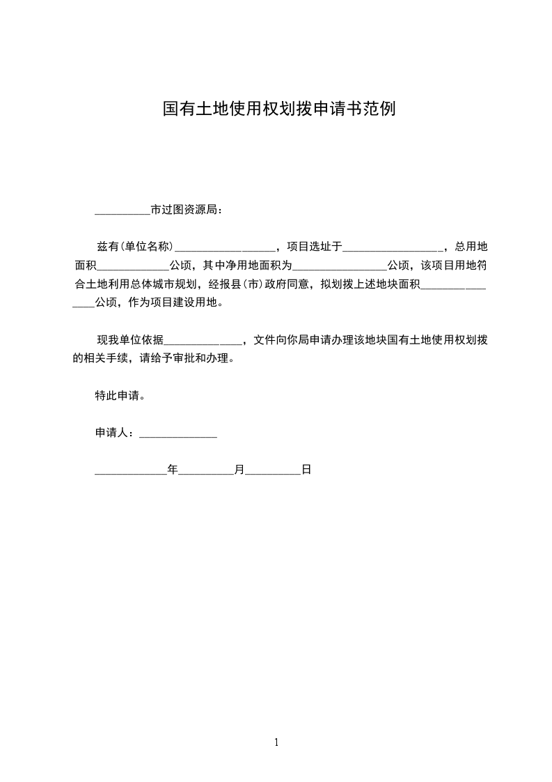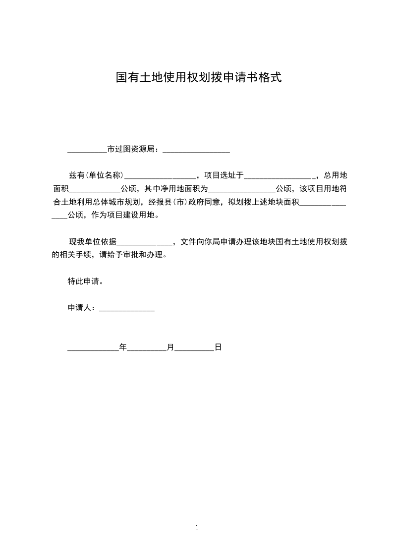 兹有(单位名称)__________________,项目选址于__________________,总用地面积_____________公顷,其中净用地面积为_________________公顷,该项目用地符合土地利用总体城市规划,经报县(市)政府同意,拟划拨上述地块面积________________公顷,作为项目建设用地。