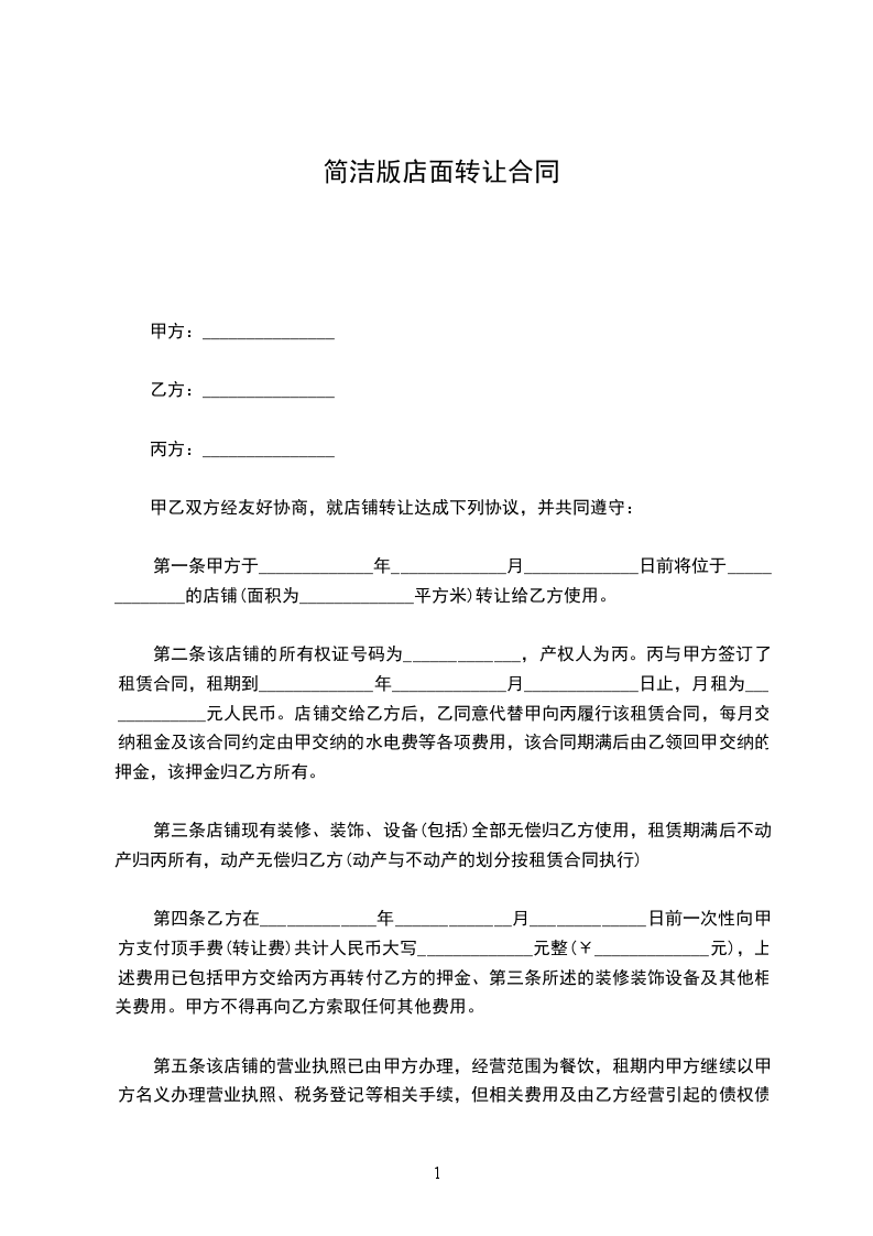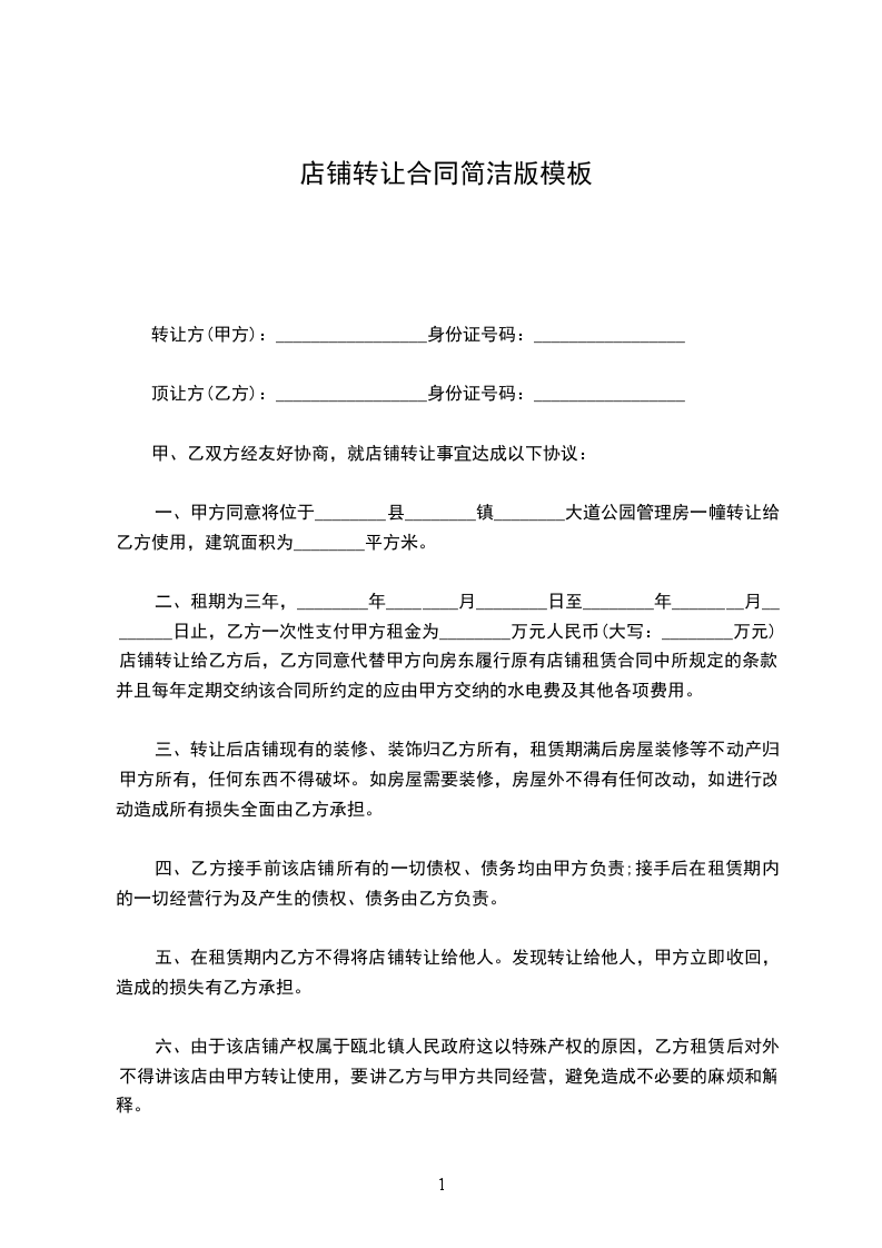 二、租期为三年,________年________月________日至________年________月________日止,乙方一次性支付甲方租金为________万元人民币(大写:________万元)。店铺转让给乙方后,乙方同意代替甲方向房东履行原有店铺租赁合同中所规定的条款,并且每年定期交纳该合同所约定的应由甲方交纳的水电费及其他各项费用。