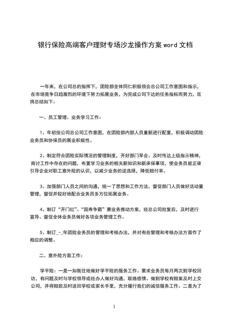学平险:一是一如既往地做好学平险的服务工作。要求业务员每月两次到学校回访,有问题及时与学校领导或经办人做好沟通,联络感情。做到学校有赔案及时上交公司,并将赔款及时送回学校或家长手里,充分履行我们的诚信服务工作。二是为了确保学平险市场的稳定与人保公司合作进行学平险的展业,全面贯彻省保险协会下发的文件精神,对学平险收费标准进行再次明确,全面安排业务员与各学校领导及经办人进行联络沟通,听取他们对公司服务及其他方面的意见,在公司总公司的有力支持下,加强与市教育局领导的联系,取得了市教育局领导的大力支持,使今年的学平险续收工作顺利完成打下坚实基矗三是在各学校即将放假前期,团险部对各大学校进行了走访,全体学平险服务人员在短短的几天内冒着酷暑将_-_万余份学平险《致学生家长的一封信和就医服务指南》及时送到学校,发至全体学生家长手中,做好前期学平险工作,最终在_月份圆满完成了学平险任务。
