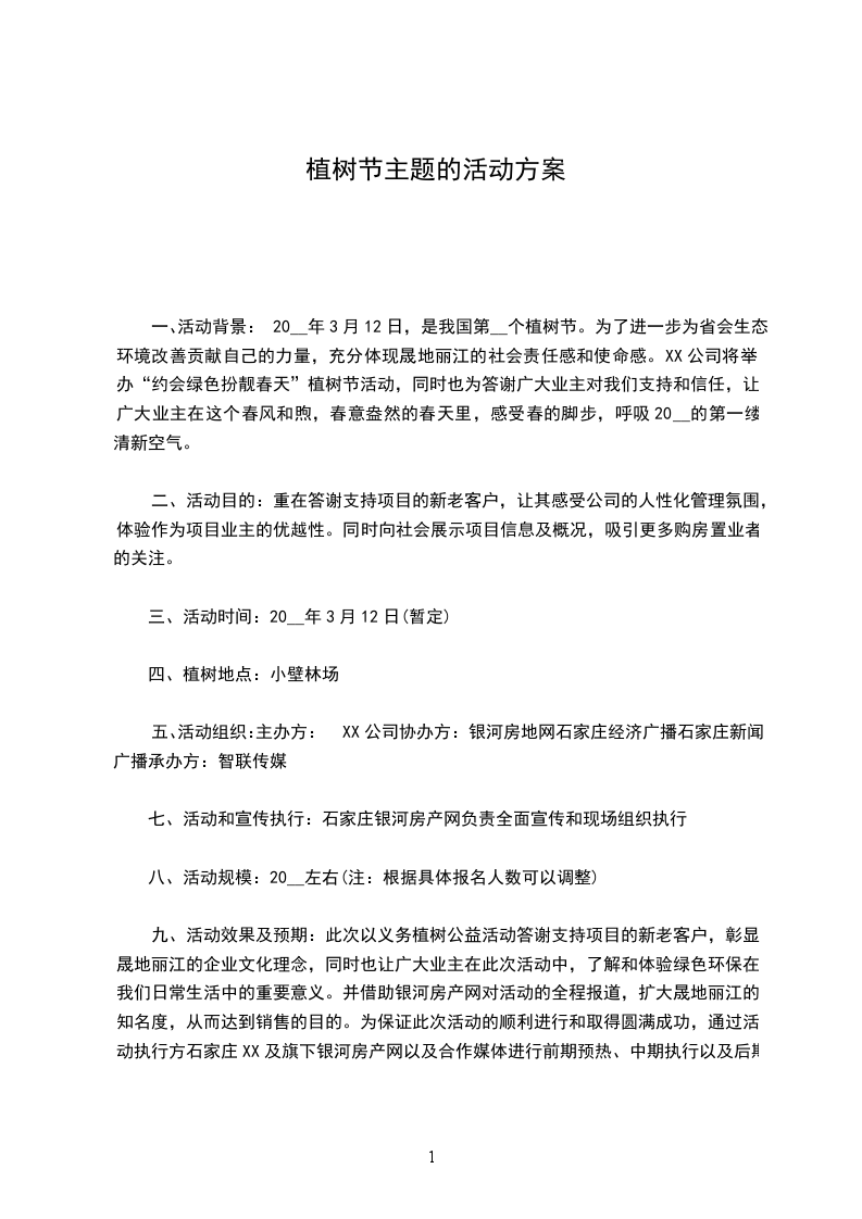 一、活动背景:20__年3月12日,是我国第__个植树节。为了进一步为省会生态环境改善贡献自己的力量,充分体现晟地丽江的社会责任感和使命感。XX公司将举办“约会绿色扮靓春天”植树节活动,同时也为答谢广大业主对我们支持和信任,让广大业主在这个春风和煦,春意盎然的春天里,感受春的脚步,呼吸20__的第一缕清新空气。