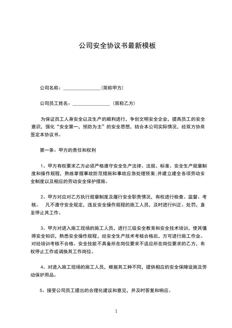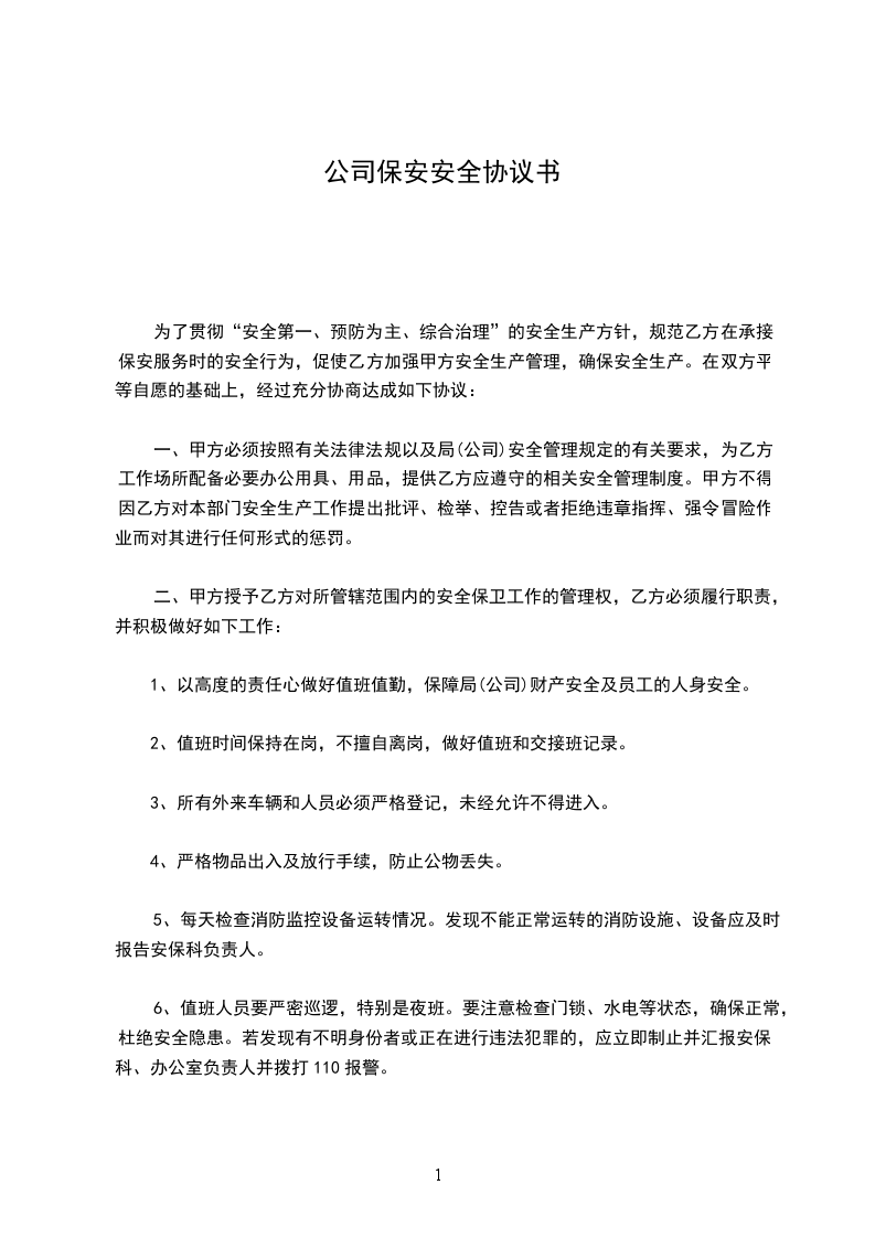 为保证员工人身安全以及生产的顺利进行,争创文明安全企业,提高员工的安全意识,强化“安全第一,预防为主”的安全思想,结合本公司实际情况,经双方协商签定本协议书。