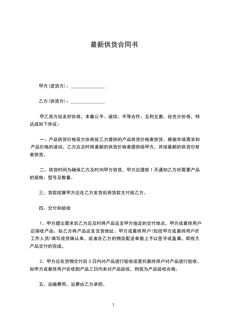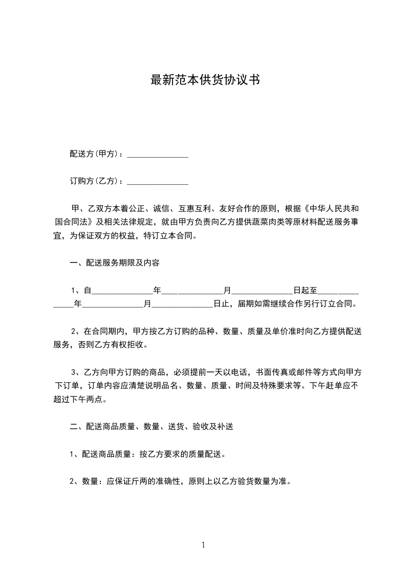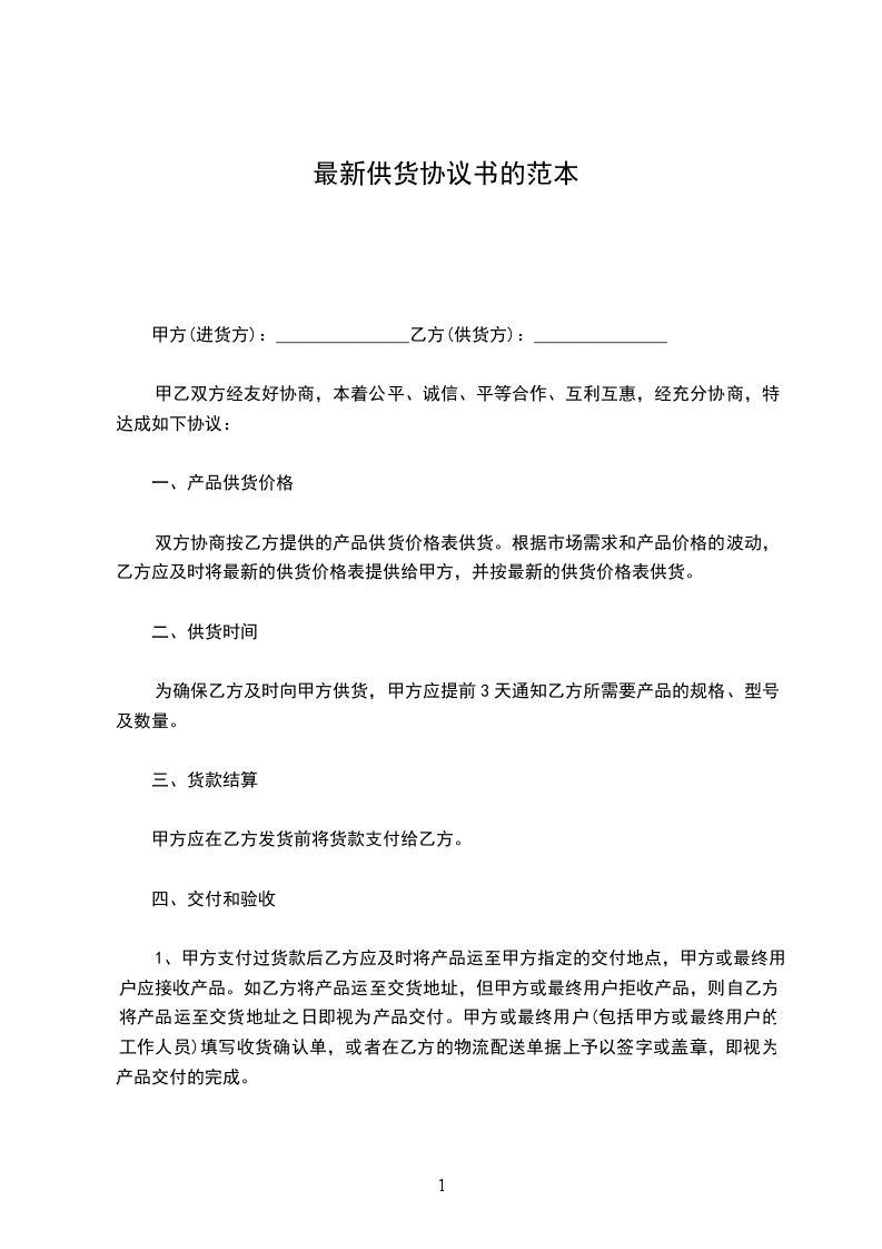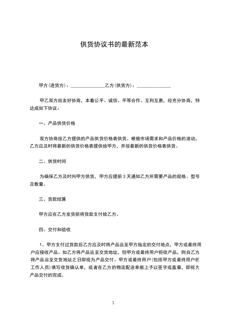 供货协议书的最新范本