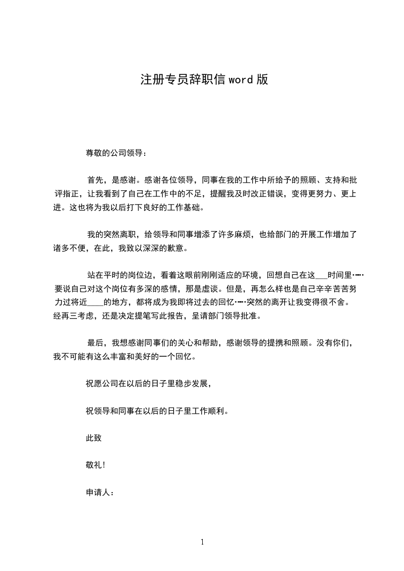 非常感谢您在这段时间里对我的教导和照顾。在公司的这段经历于我而言非常珍贵。将来无论什么时候,我都会为自己曾经是公司的一员而感到荣幸。我确信在公司的这段工作经历将是我整个职业生涯发展中相当重要的一部分。我的辞职书呈上,最后祝公司领导和所有同事身体健康,工作顺利,公司生意兴隆,发展越来越好!