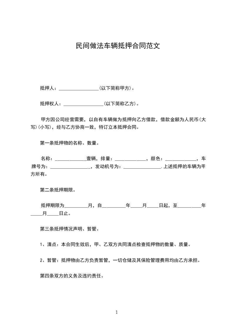 甲方因公司经营需要,以自有车辆做为抵押向乙方借款,借款金额为人民币(大写)(小写),经与乙方协商一致,特订立本抵押合同。