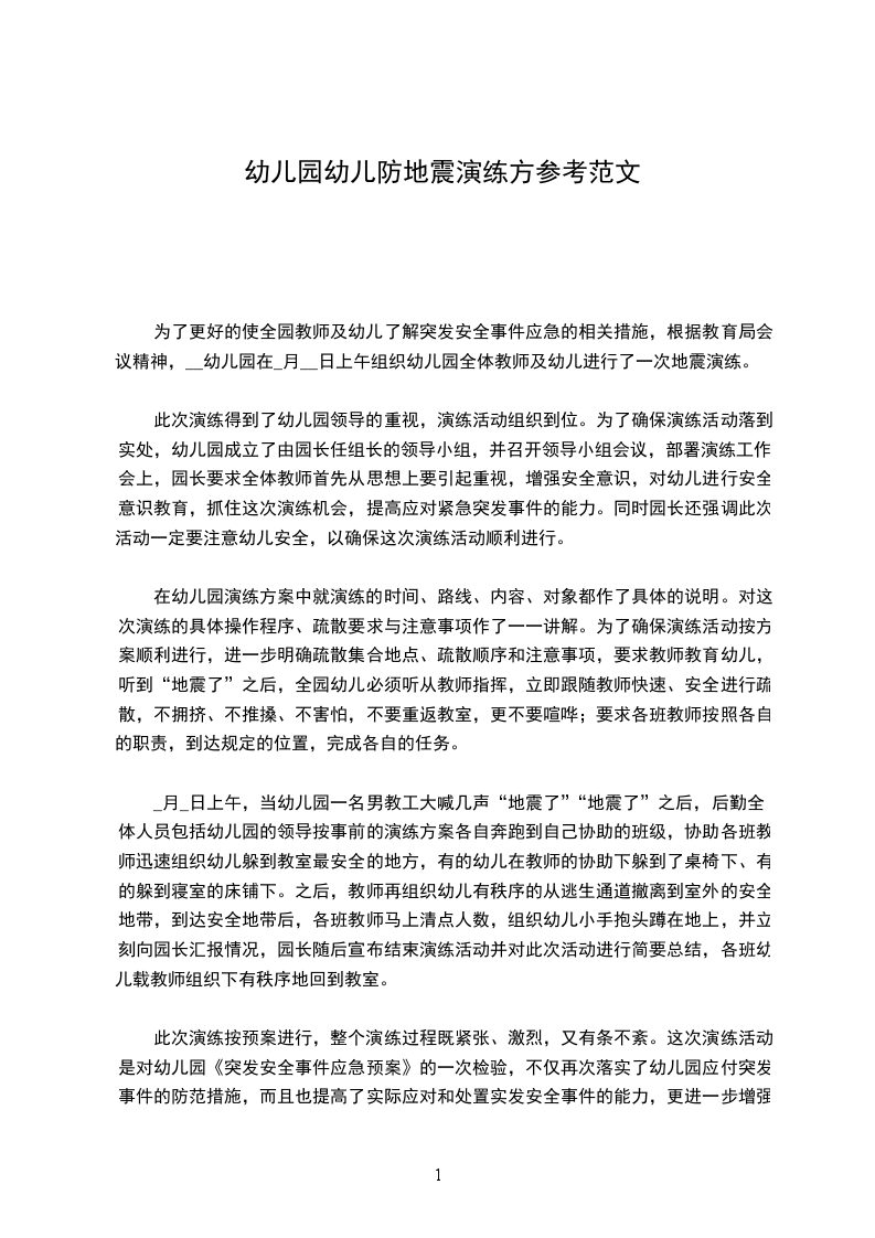 为了更好的使全园教师及幼儿了解突发安全事件应急的相关措施,根据教育局会议精神,__幼儿园在_月__日上午组织幼儿园全体教师及幼儿进行了一次地震演练。