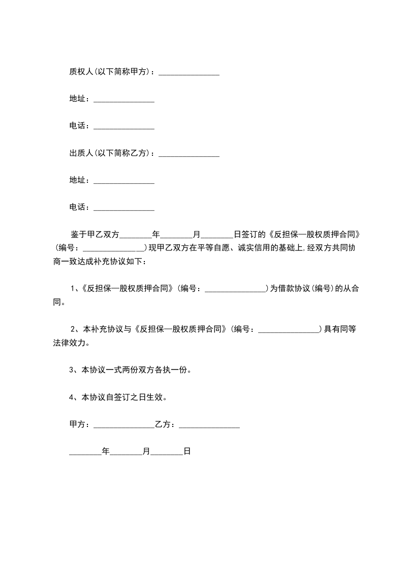 鉴于甲乙双方________年________月________日签订的《反担保—股权质押合同》(编号:_______________)现甲乙双方在平等自愿、诚实信用的基础上,经双方共同协商一致达成补充协议如下: