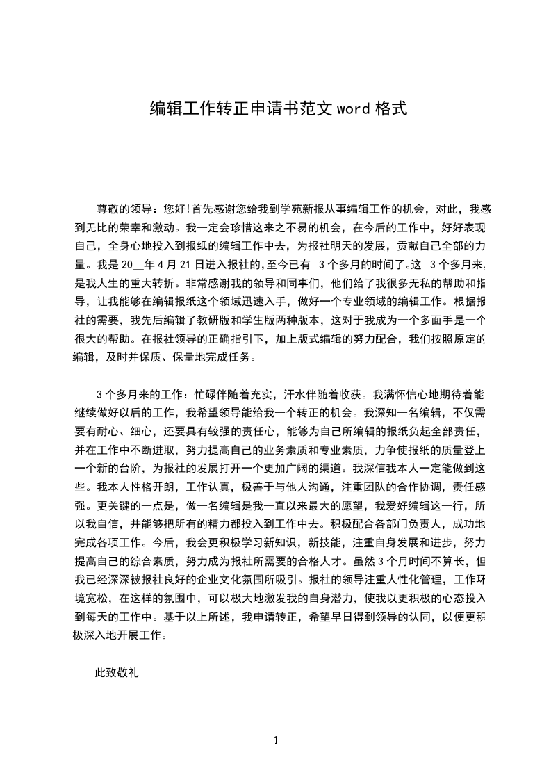 尊敬的领导:您好!首先感谢您给我到学苑新报从事编辑工作的机会,对此,我感到无比的荣幸和激动。我一定会珍惜这来之不易的机会,在今后的工作中,好好表现自己,全身心地投入到报纸的编辑工作中去,为报社明天的发展,贡献自己全部的力量。我是20__年4月21日进入报社的,至今已有3个多月的时间了。这3个多月来,是我人生的重大转折。非常感谢我的领导和同事们,他们给了我很多无私的帮助和指导,让我能够在编辑报纸这个领域迅速入手,做好一个专业领域的编辑工作。根据报社的需要,我先后编辑了教研版和学生版两种版本,这对于我成为一个多面手是一个很大的帮助。在报社领导的正确指引下,加上版式编辑的努力配合,我们按照原定的编辑,及时并保质、保量地完成任务。
