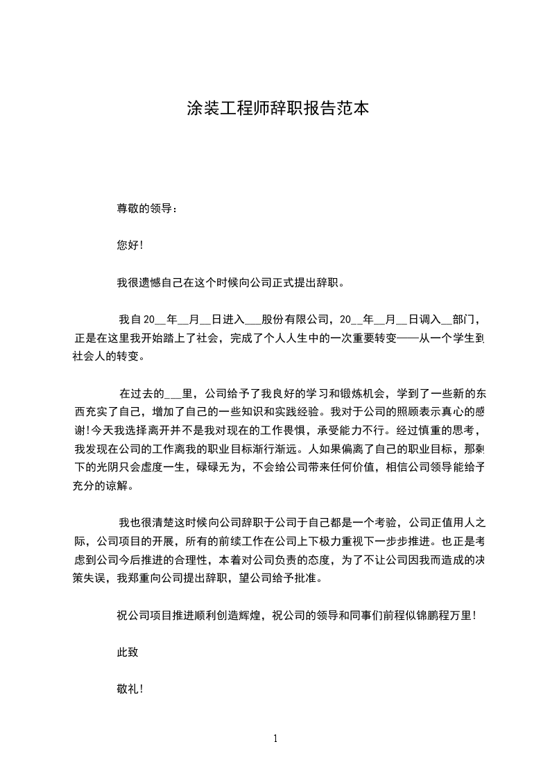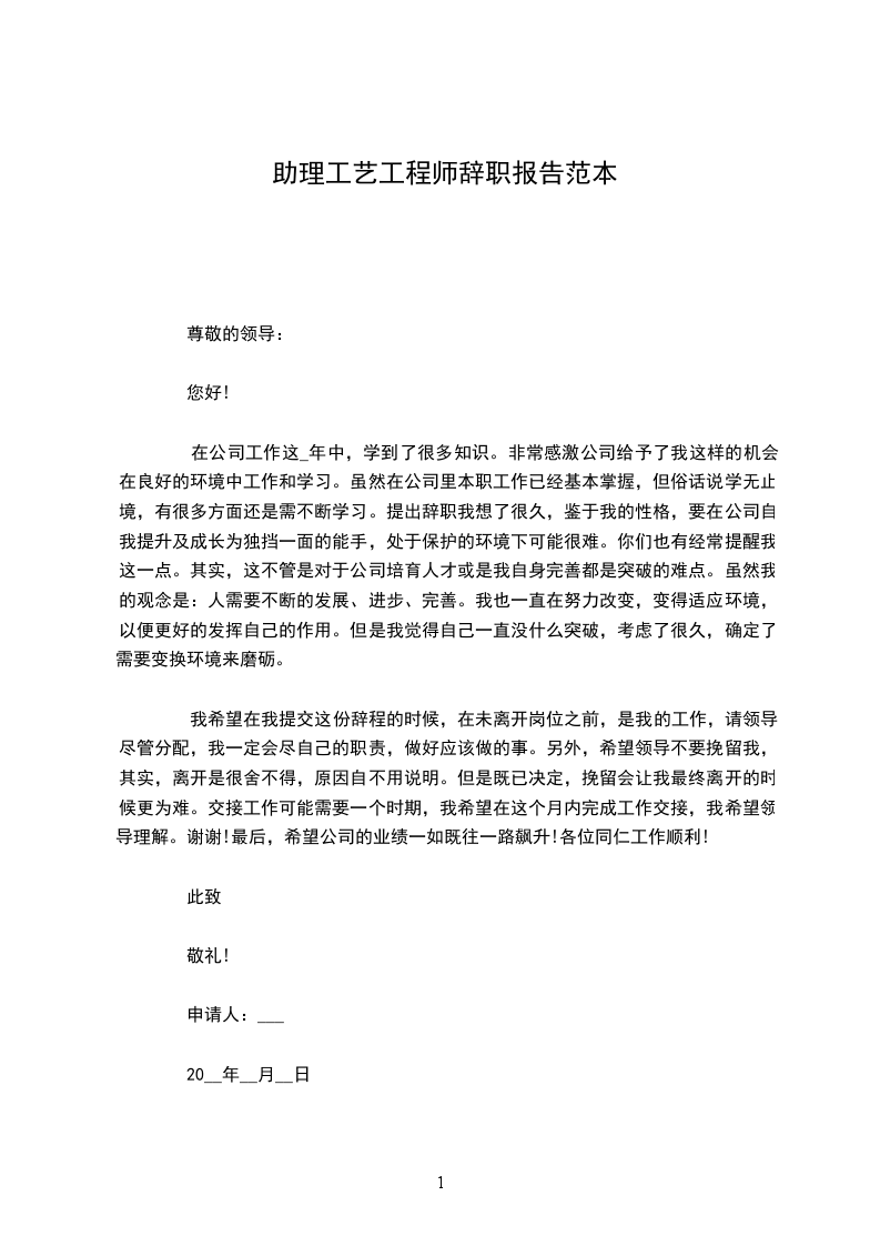 涂装工艺工程师助理辞职报告范本