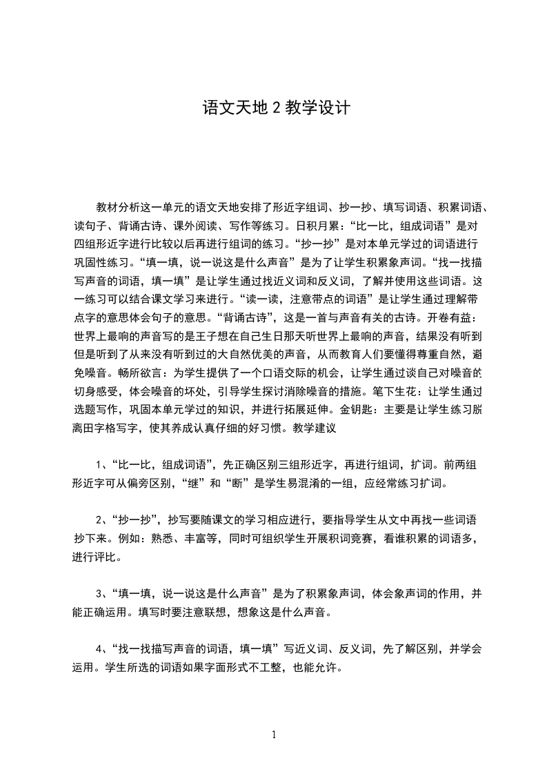 教材分析这一单元的语文天地安排了形近字组词、抄一抄、填写词语、积累词语、读句子、背诵古诗、课外阅读、写作等练习。日积月累:“比一比,组成词语”是对四组形近字进行比较以后再进行组词的练习。“抄一抄”是对本单元学过的词语进行巩固性练习。“填一填,说一说这是什么声音”是为了让学生积累象声词。“找一找描写声音的词语,填一填”是让学生通过找近义词和反义词,了解并使用这些词语。这一练习可以结合课文学习来进行。“读一读,注意带点的词语”是让学生通过理解带点字的意思体会句子的意思。“背诵古诗”,这是一首与声音有关的古诗。开卷有益:世界上最响的声音写的是王子想在自己生日那天听世界上最响的声音,结果没有听到,但是听到了从来没有听到过的大自然优美的声音,从而教育人们要懂得尊重自然,避免噪音。畅所欲言:为学生提供了一个口语交际的机会,让学生通过谈自己对噪音的切身感受,体会噪音的坏处,引导学生探讨消除噪音的措施。笔下生花:让学生通过选题写作,巩固本单元学过的知识,并进行拓展延伸。金钥匙:主要是让学生练习脱离田字格写字,使其养成认真仔细的好习惯。教学建议