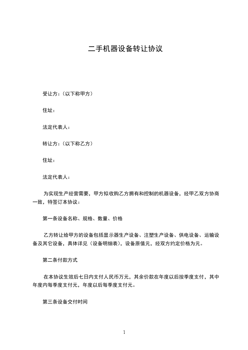 乙方转让给甲方的设备包括显示器生产设备、注塑生产设备、供电设备、运输设备及其它设备,具体详见(设备明细表),设备原值元,经双方约定价格为_____元。