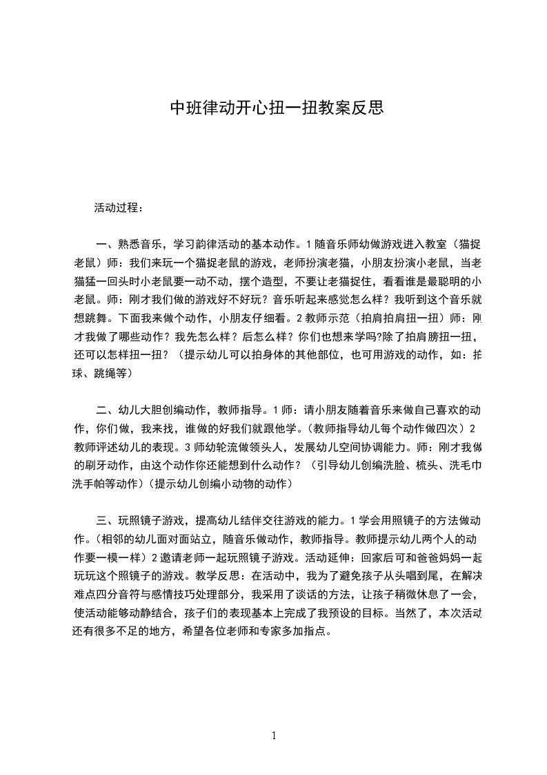 一、熟悉音乐,学习韵律活动的基本动作。1随音乐师幼做游戏进入教室(猫捉老鼠)师:我们来玩一个猫捉老鼠的游戏,老师扮演老猫,小朋友扮演小老鼠,当老猫猛一回头时小老鼠要一动不动,摆个造型,不要让老猫捉住,看看谁是最聪明的小老鼠。师:刚才我们做的游戏好不好玩?音乐听起来感觉怎么样?我听到这个音乐就想跳舞。下面我来做个动作,小朋友仔细看。2教师示范(拍肩拍肩扭一扭)师:刚才我做了哪些动作?我先怎么样?后怎么样?你们也想来学吗?除了拍肩膀扭一扭,还可以怎样扭一扭?(提示幼儿可以拍身体的其他部位,也可用游戏的动作,如:拍球、跳绳等)