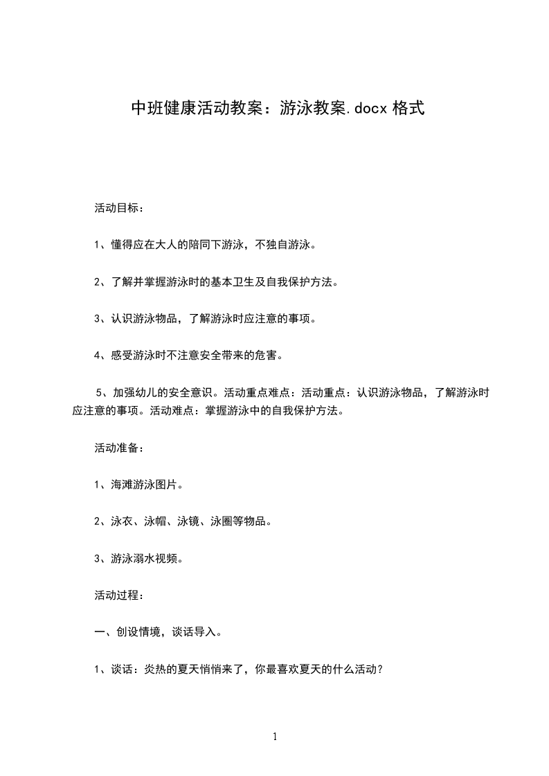 5、加强幼儿的安全意识。活动重点难点:活动重点:认识游泳物品,了解游泳时应注意的事项。活动难点:掌握游泳中的自我保护方法。